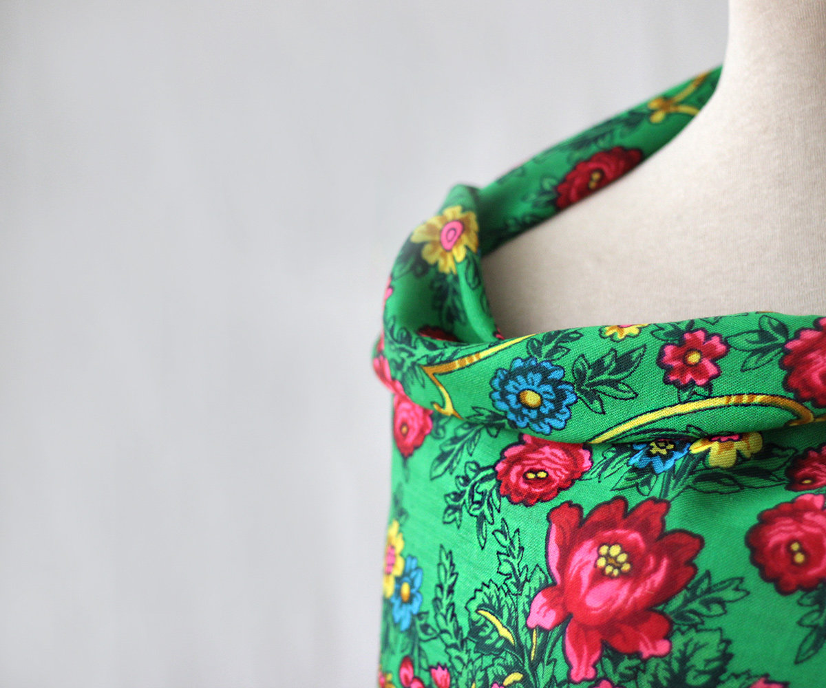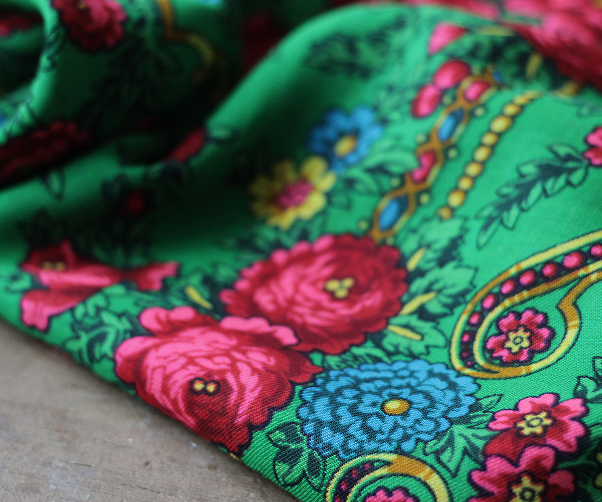 «У меня он поначалу «Cлавянкой» назывался, – говорит Ирина Петровна. – А родился так. Году в 65-м поехали мы в Минск – делать зарисовки национальных костюмов и вышивок. И на Яблочный Спас попали в одно село. Церковь, зеленый луг перед ней, и все люди в национальных костюмах, а женщины – в старинных платках. Зеленых, белых, красных. Нас так гостеприимно приняли, яблок надавали, бубликов, пряников. Одна бабушка к себе водила, показала старинные платки, штук 7 в сундучке. Рассказала, что эти платки передаются от бабок внучкам, а когда девушка выходит замуж, должна в приданом иметь несколько платков. У них как раз одна выходила, и они спросили, не можем ли мы прислать платки. А у нас тогда в магазинах невозможно было купить, все отправляли по республикам. От того хорошего настроения у меня и родился платок «Славянка». Мне кажется, что-то я в нем нашла, какую-то черточку народную. А все потому, что красного цвета много, такой красивый, радостный цвет счастья, неслучайно национальные костюмы многих народов отделывают красным.