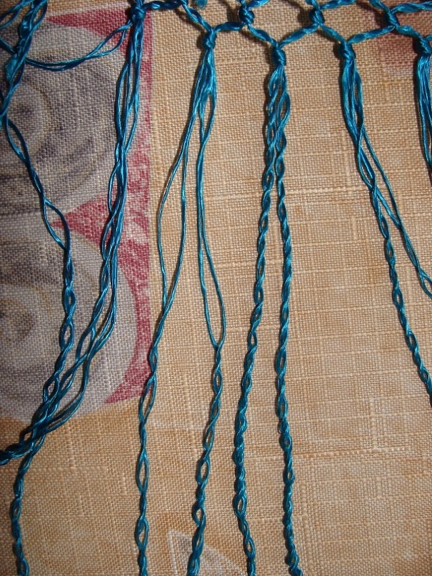 Моя бахрома вид не потеряла. В общей массе смотрится совершенно нормально. Просто некоторые ниточки как бы раскрутились. Причём не все, а некоторые! Если вспомнить, что на старых уплотнёнках 150*150 тонюсенькая бахрома и многим нравится, то эта не воспринимается как непоправимый ужас. Ужас, это когда она после первой же носки вся расплетается и превращается в мочалку! Опыт мытья бахромы был мною предпринят пока только в отношении этой бирюзовой неожиданности. Стала замечать, что раздваивающиеся ниточки, в месте последнего узелочка, норовят переплестись между собой! Может, позволить им это сделать? ><