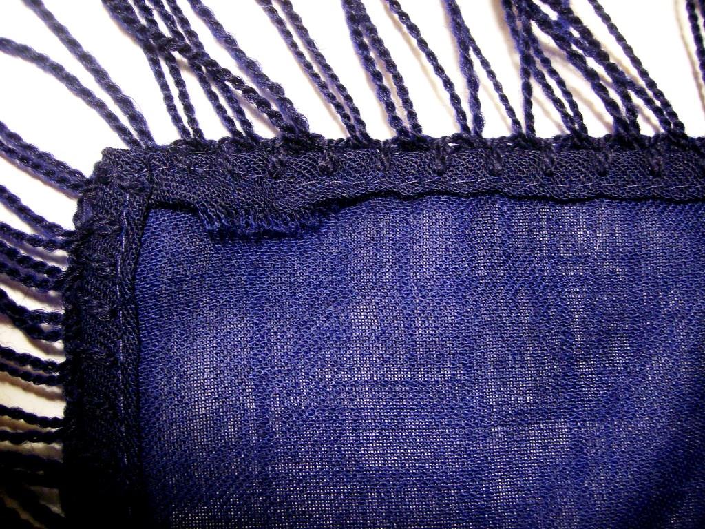 Впечатление такое, что платок подшивали в темном подвале. Строчка не у края подгибки, а посередине, поэтому вылез срез ткани в двух местах. По всему периметру шали торчат вшитые нитки самой ткани.