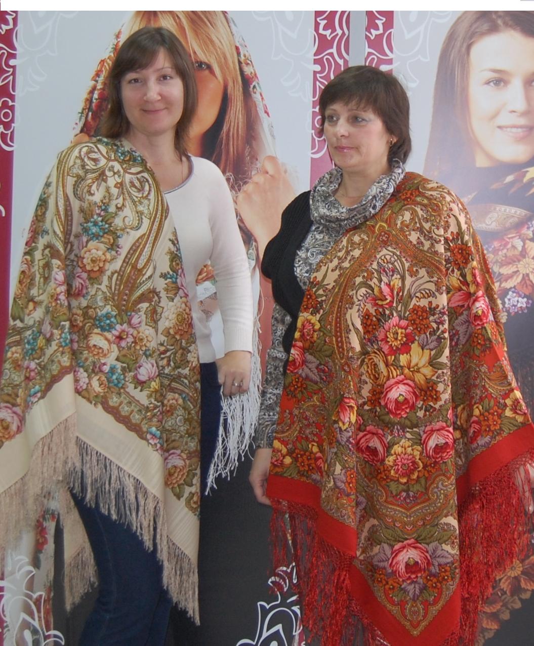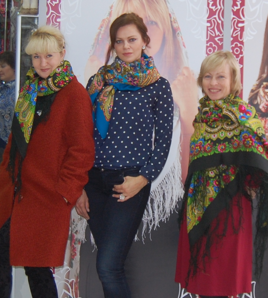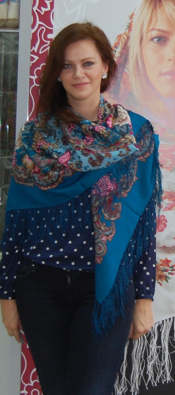 На Оле прекрасен любой платок, на Марине особенно понравились палантин Расцветающие камни - 60, платочки : Восточный калейдоскоп и Волшебный танец, синее с розовым сочетание. В Классический -14 я влюбилась, он замечательный и подходит всем, так же как и Испанский -14.