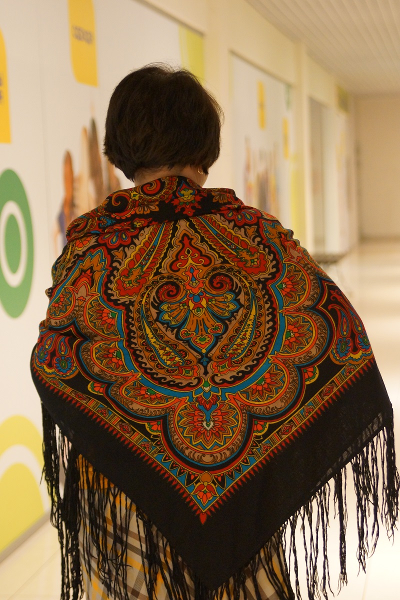 Женя тоже примеряла и красовалась в замечательных платочках. И, поверьте, ее грациозностью и удивительным умением завернуть и уложить платок трудно не восторгаться! А самое интересное, Женя принесла неизвестный платочек-старинку. Вроде, его фотографировали. Может, выложат девочки в другой теме...[/quote]