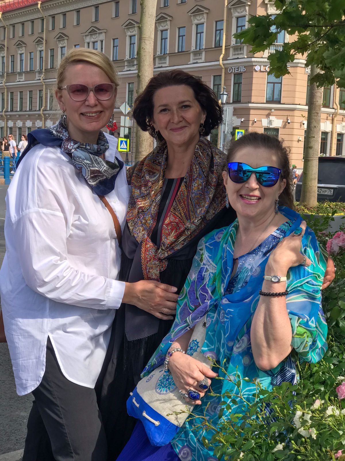 Долго любовалась и нарядами вашими, и платками: стильная Олечка-Дусятко в белой рубашке и в шелковом Санкт-Петербурге, ты в черном платье и шелковом Жасмине, и лучезарная Люся- Аметист в невероятных бирюзовых переливах (платок не опознала, видимо, Палитра?)
