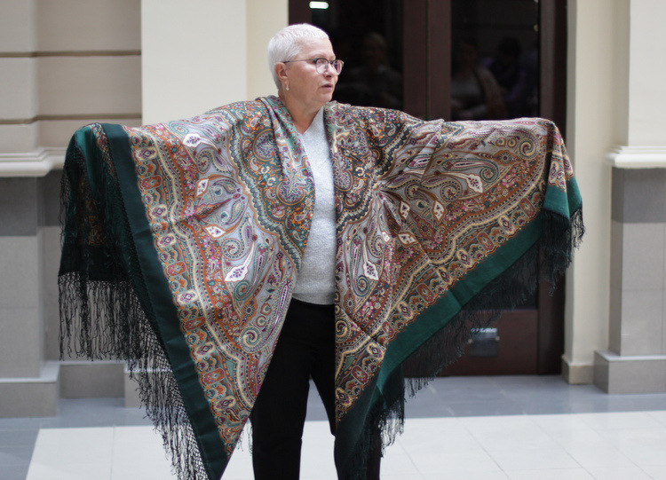 Ну, тут прекрасно всё - отдохнувшая, загорелая под крымским солнцем красавица Надежда. Этот черный творческий наряд. Украшения авторской финифти.Обувь. И великолепная шаль, идеально подходящая владелице.