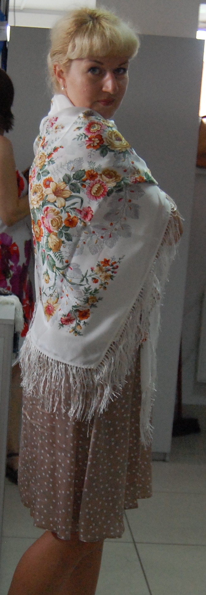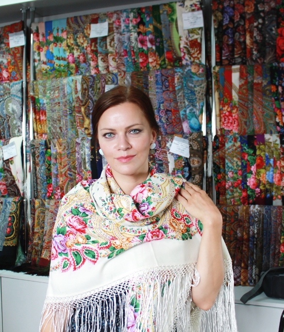 На встречу мы поехали с подругой, совсем недавно заразившейся платочной болезнью. Но она уже обладательница нескольких шелковых шалей. Девушки в магазине уже начали примерять шали.