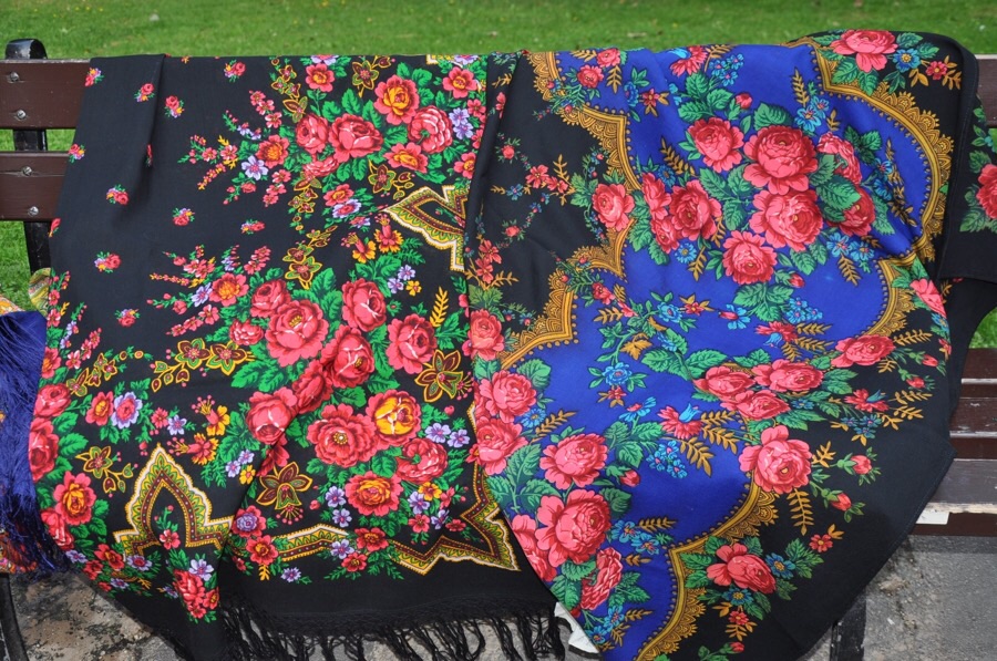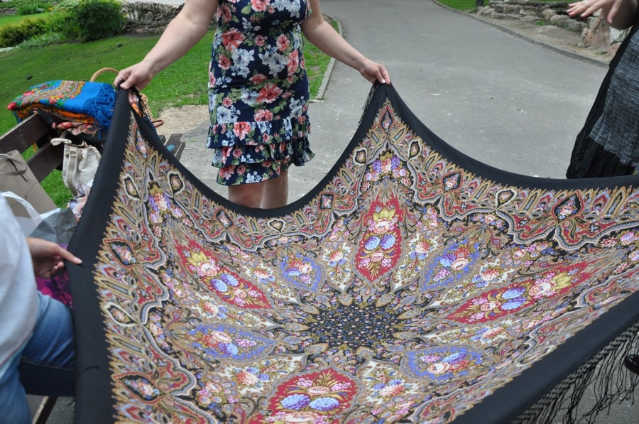 Заняли скамейку рядом со Старым городом в парке. Постепенно скамейка всё покрывалась шалями и платками. Всё вызывал интерес у прохожих, кто интересовался - что продают, кто то удивлялся. Познакомились и с очень интересной женьщиной, русской, которая живёт в Лондоне. Была удивлена то что всё это наши колекции. У неё всё нравилось.