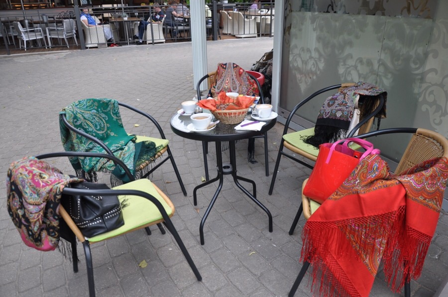 После примерок ведь надо присесть и поговорить о том и сём. Но до этого наш столик в кафе показался интересным и без хозяек платков.