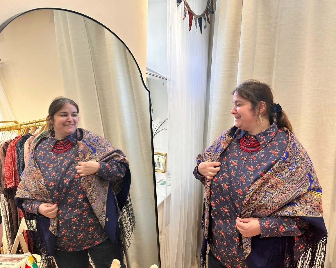 Демонстрируем ношение платков и шалей.