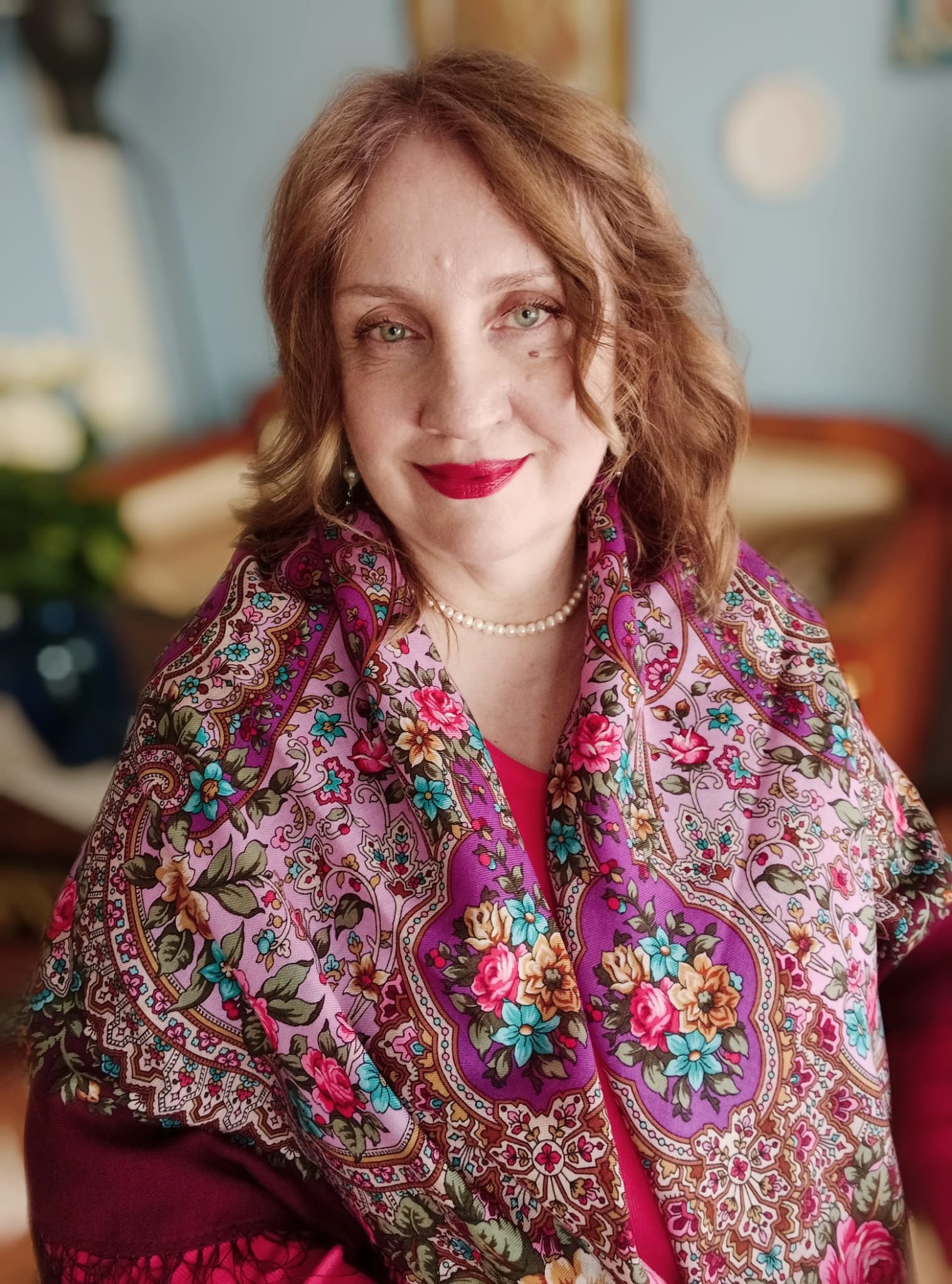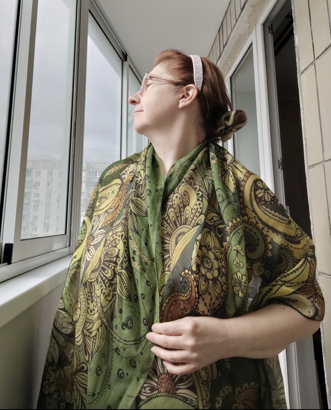 Ася, залюбовалась вашей фотокарточкой. Такие изящные мелкие узоры платка, такие красивые краски. И ваши локоны этого мягкого и тёплого оттенка. Не могу подобрать ему названия. Удивительная гармония получилась. Приятная глазу.