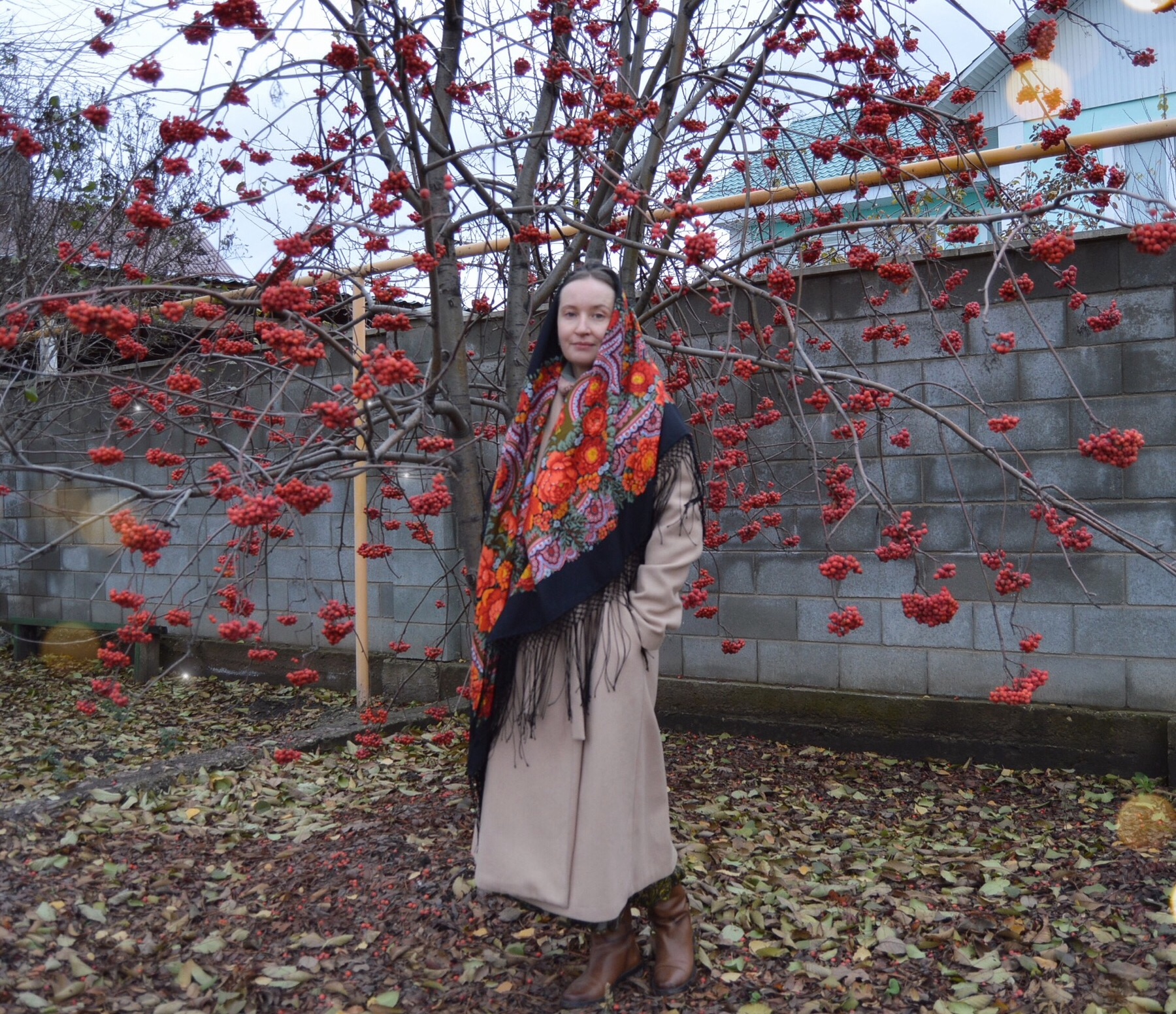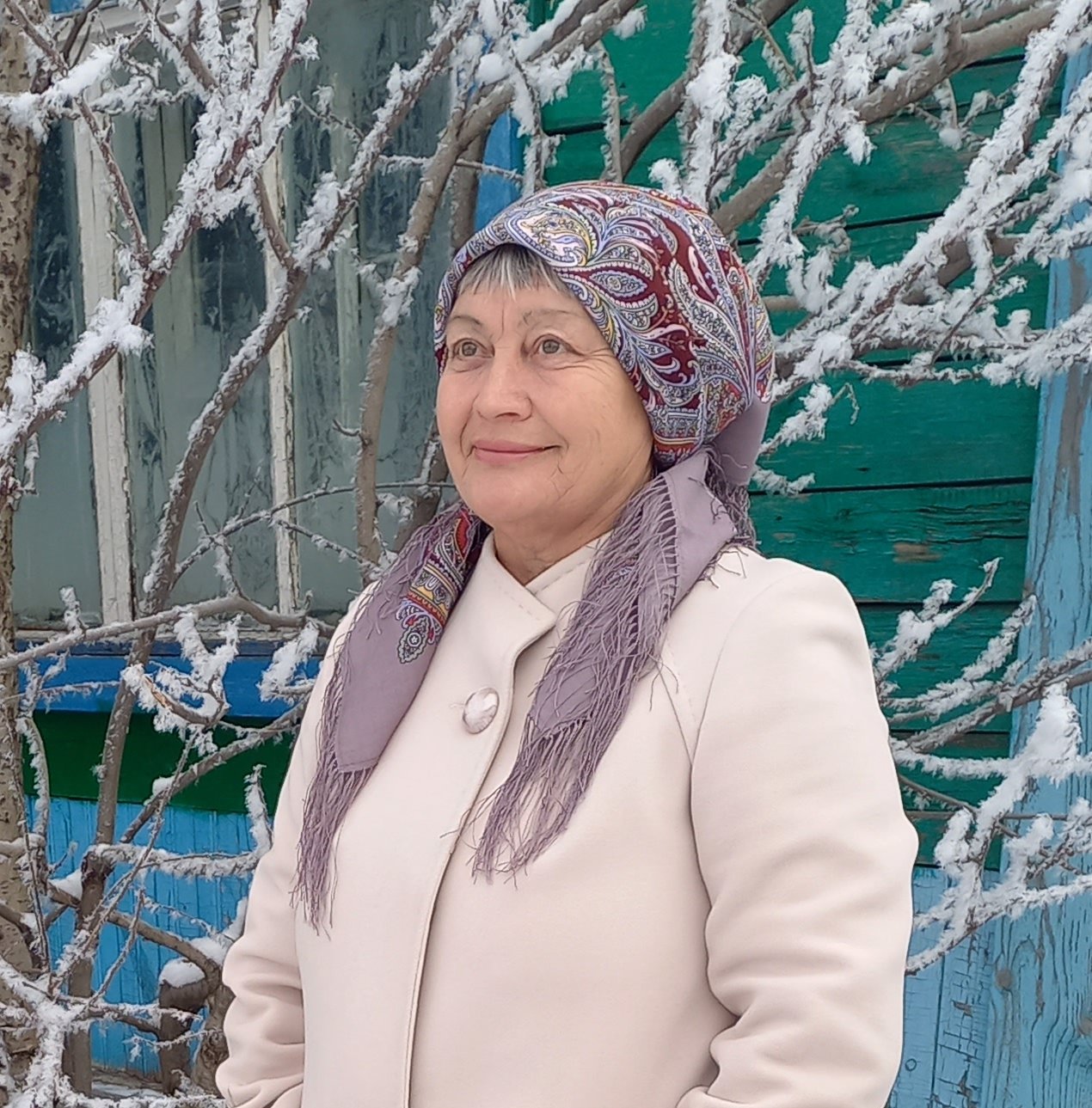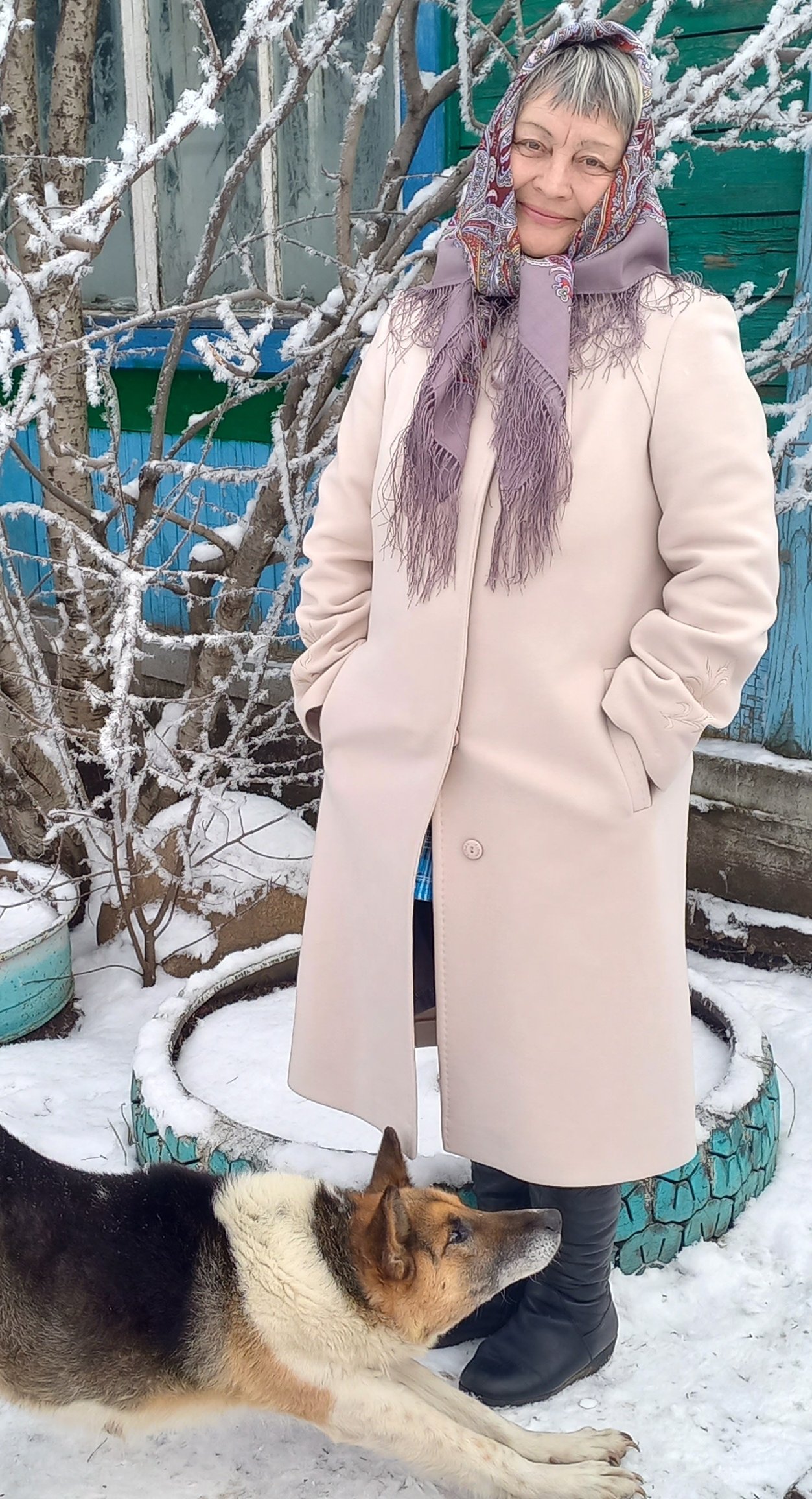 пряха нравится этот платок на вас с пальто, особенно на голове когда узлы назад, не накручено когда на голове. Идет вам.