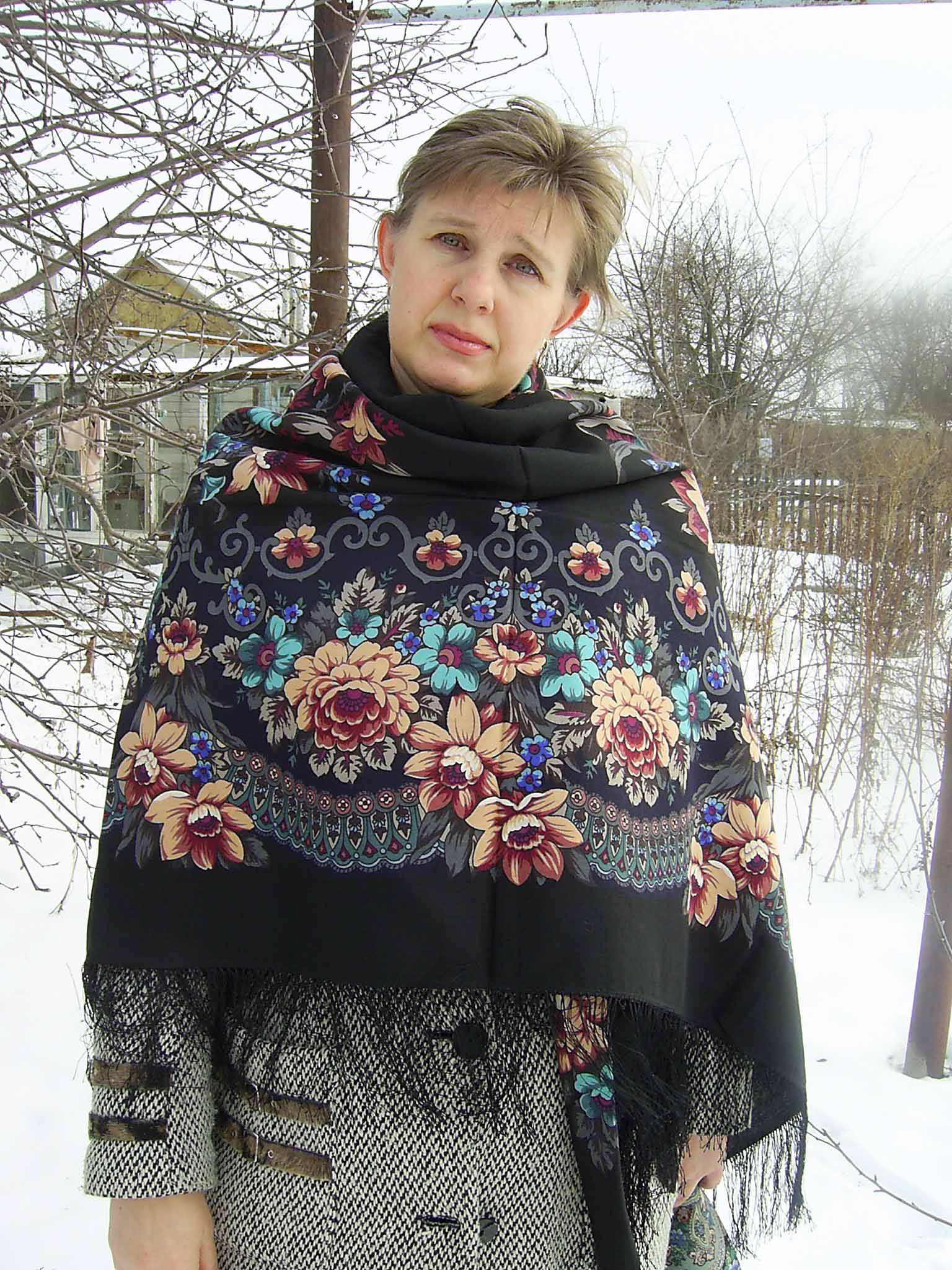 Хочу показать ещё одно моё приобретение - шаль из распродажи Натали 365-25. Заранее прошу извинить за выражение лица, белый снег в солнечный день слепит глаза до слёз.
