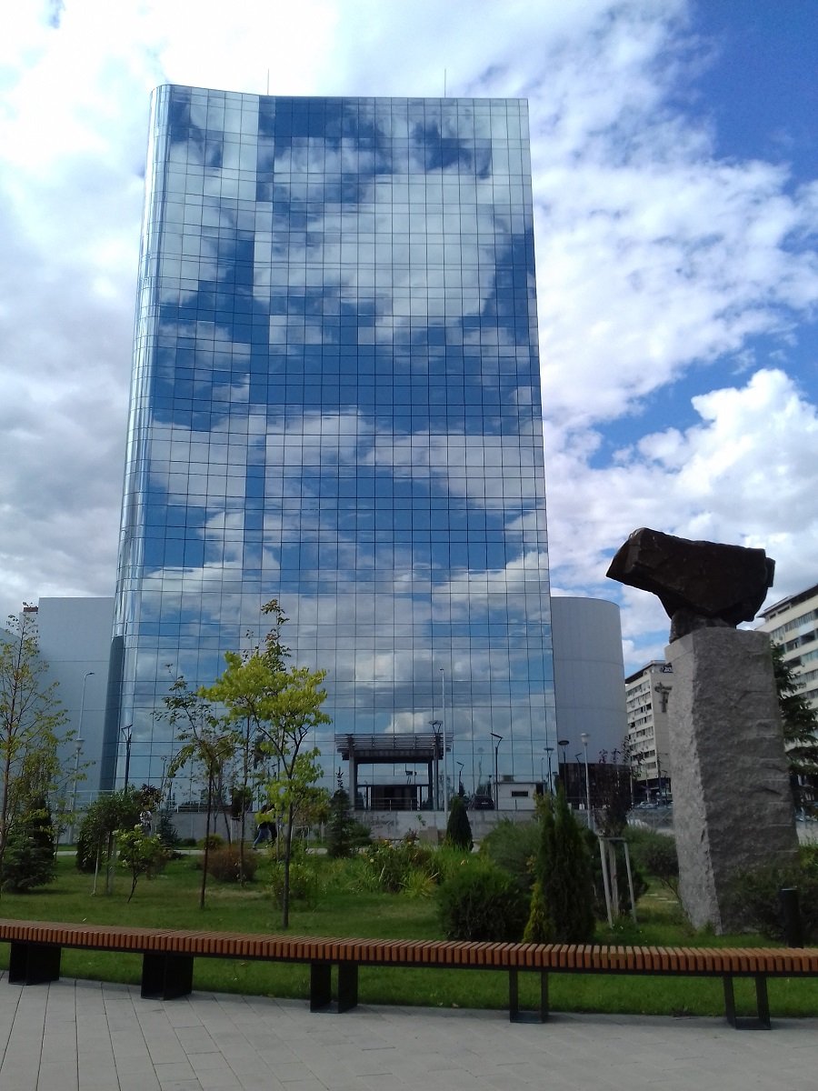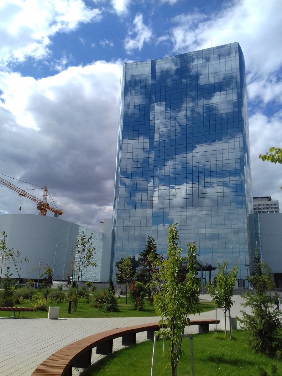 Впервые даже понравилось это сооружение. Как задержались облака на этих стенах, засмотрелись на себя,как в зеркало.