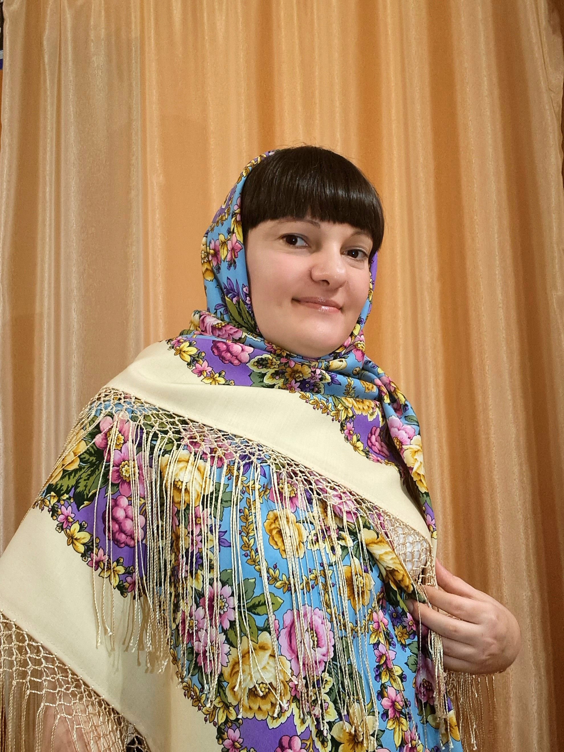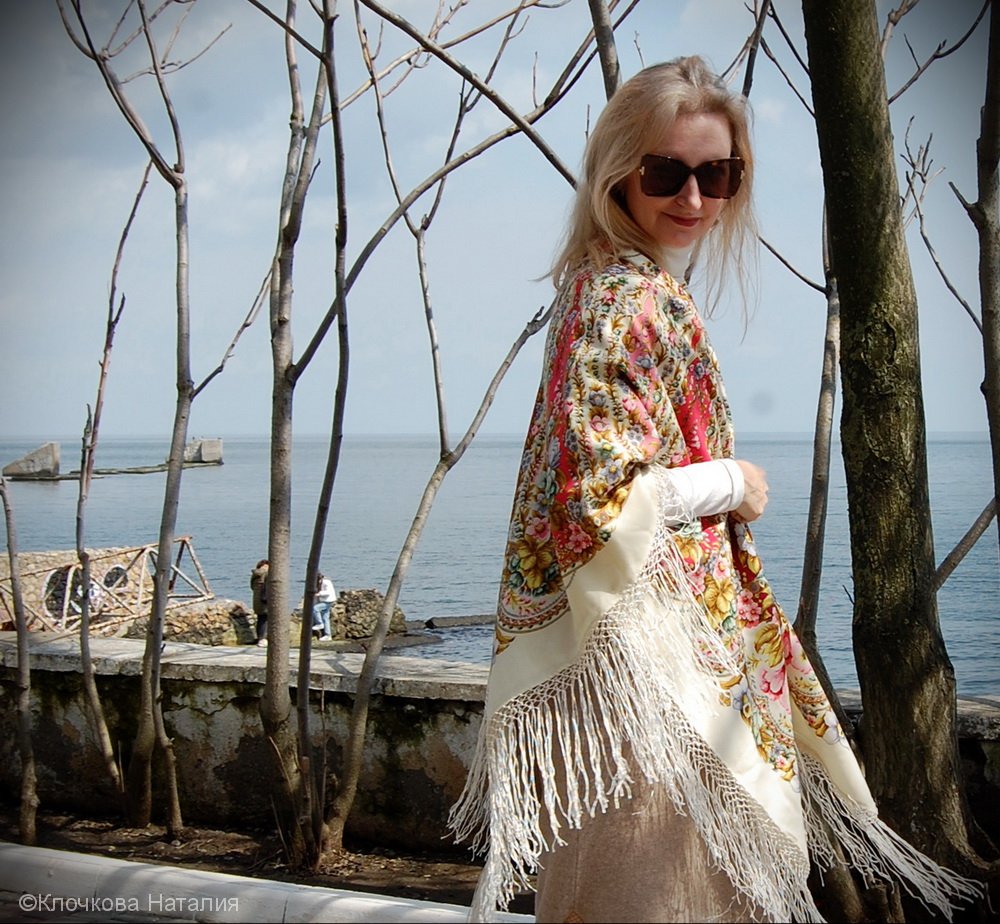 Думаю, что этот Павловопосадский можно будет носить, скрутив поплотнее, не на голове. Реально, платок неоднозначный. Зато вкус мужа понятен)