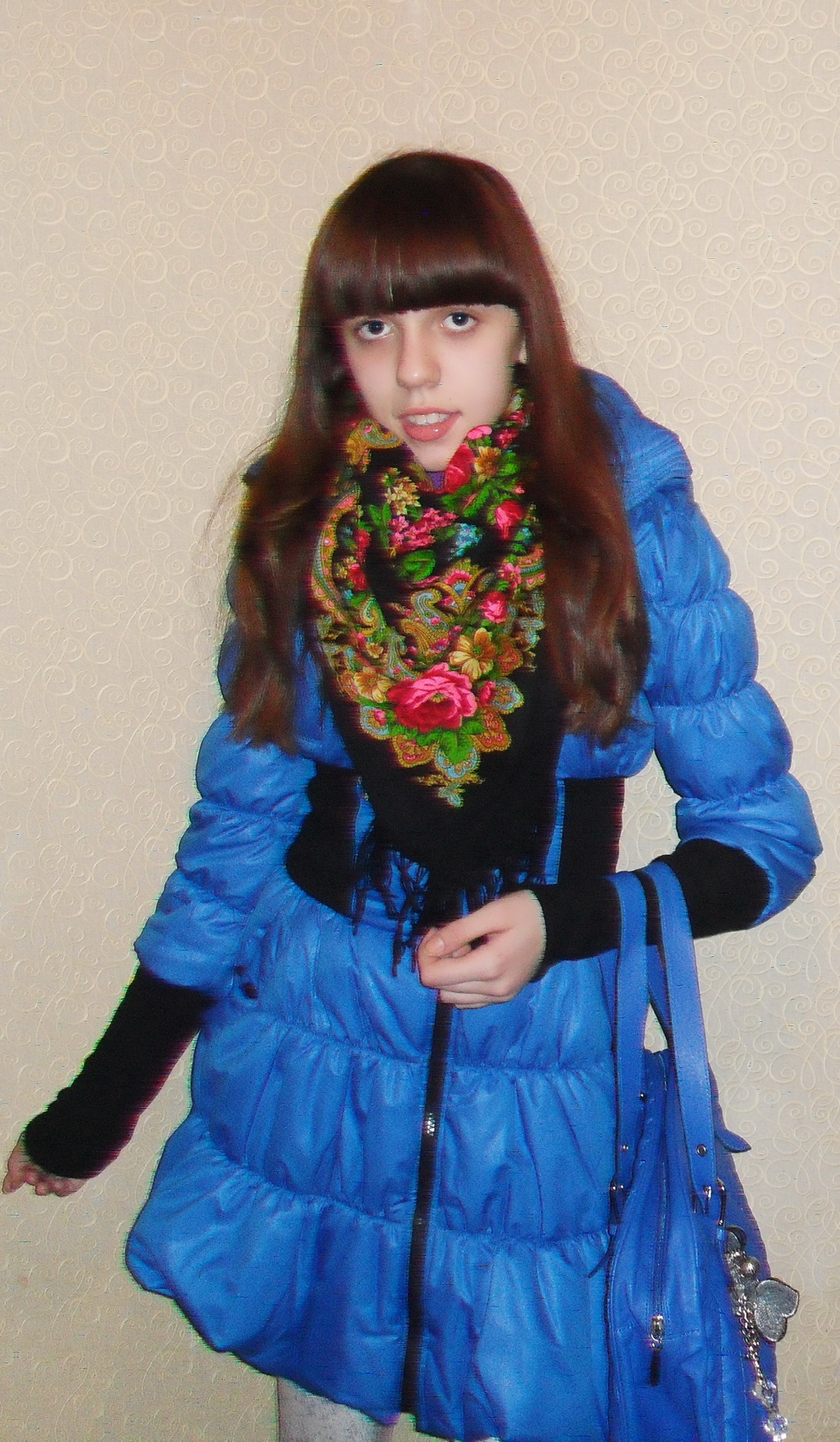 А дочурка - прелесть. Заметила, что молоденькие девушки чаще выбирают такие традиционные расцветки и так их повязывают. У меня дочка носит платочки 89х89, ей их удобнее наматывать вокруг шеи - меньше объем складок ("Незнакомка" черная близка по расцветке к сумеркам). А когда были морозы под 40, и старшеклассники ходили в школу на занятия, она брала у меня большую шаль и заворачивалась в нее в школе. Чем, говорит, сидеть в верхней одежде, так лучше в шали - тепло и легко.