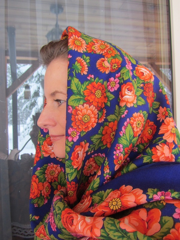 Аманда, вот, на мой взгляд, в таком стиле и нужно носить платки- с однотонным платьем, сочетающимся по цвету с самыми заметными элементами рисунка.