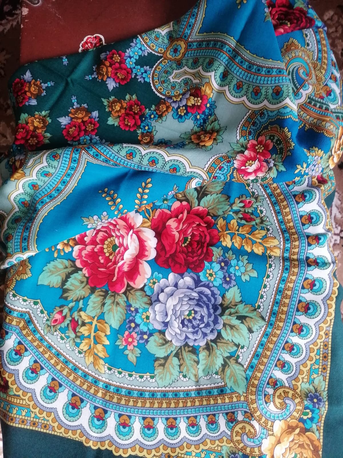 Добавлю еще бирюзы! Кто не хотел Петрушку? Это я! Платочек замечательный, но я и сейчас еще в сомнениях! Первые впечатления пожалуй самые верные ! Слишком веселый , сказала я подруге, мне бы что-нибудь задумчивое, осень наверное навевает такие настроения! Но показать - покажу, правда на работе, дождь у нас и облачно! Кайма кстати почти ровная, от 5 до 5,5 см.