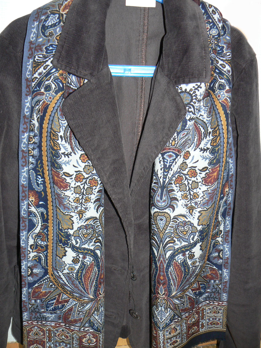Начну сама и даже не с шали. Вот, например, «Дон Кихот» Елены Жуковой 1010-14, покупала для мужа, пока доехала до дома, поняла, что «моё». Ведь и женщины носят шарфики. Смотрите, как он меняется, в зависимости от того, с чем носить и какой тон получает «поддержку».