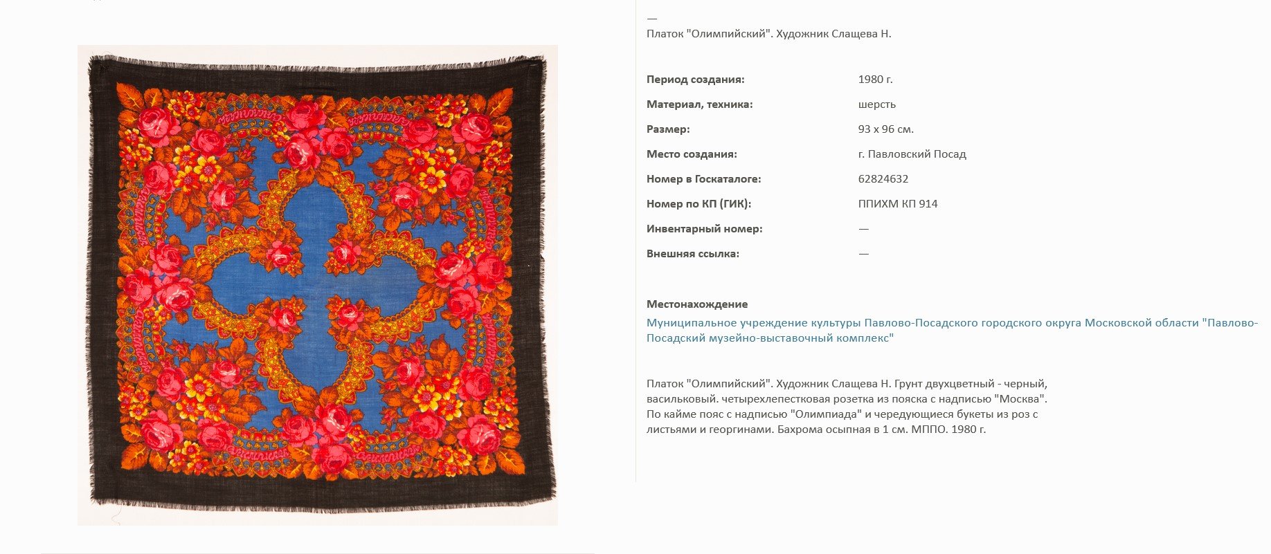 Напомню, что мы обсуждаем сведения из Госкаталога Музейного фонда РФ, которые разместил Павлово-Посадский музейно-выставочный комплекс. (ПМВК).
