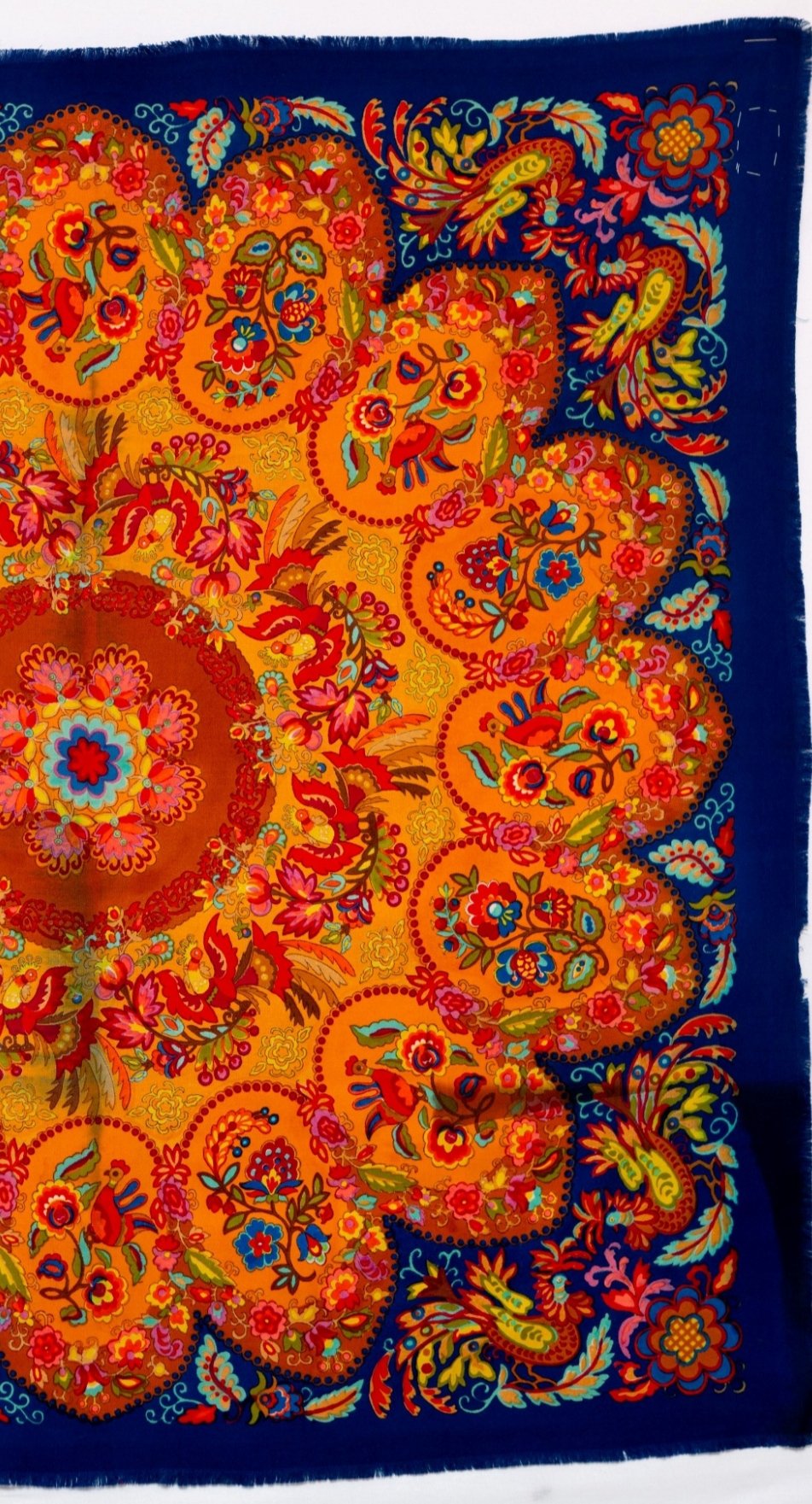 "Петухи" - платок Регуновой. Здесь чуть посложнее, еще глаз не привык к такому роскошному орнаменту! И у вас вроде бы есть эта шаль. Вам тут и карты в руки. После войны такого типа платки рисовали ( та же "Киргизия" Ольшевской). На фото Штыхина и Регуновой 1950-х гг. они как раз обсуждают нечто подобное. Так что пусть пока в моей системе координат это будет платок Регуновой. А про украинский акцент написано в аннотации к этой шали из Госкаталога.