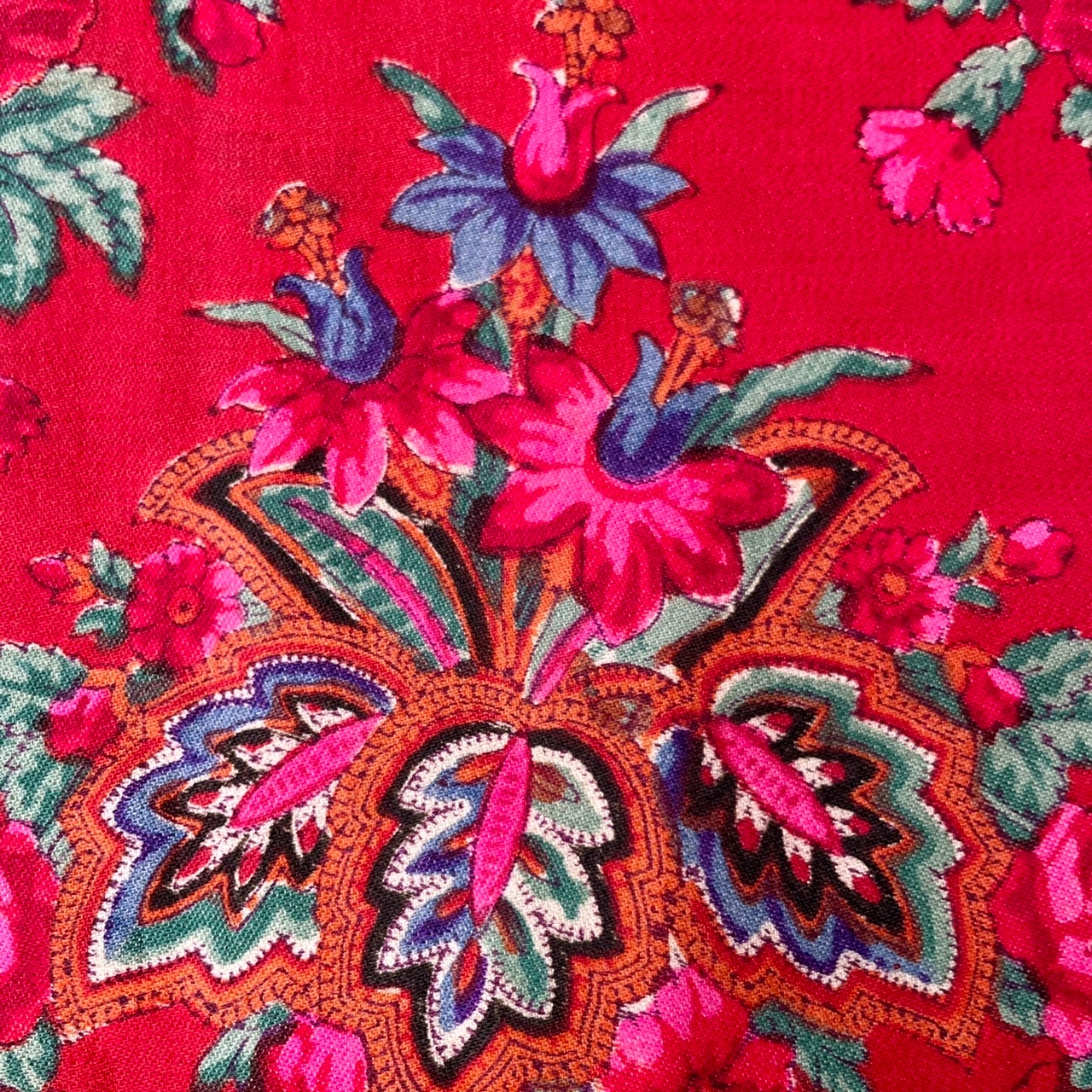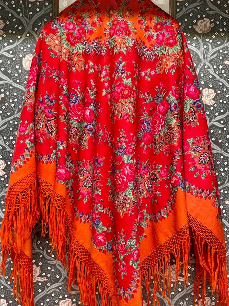 Привезла вчера шаль и весь вечер любовалась. Антикварный ППД_11, конец XIX - начало XX века в цветовом решении, которое у нас в архиве не было ещё представлено. Кайма и средник оранжевые, рисунок по красному полю. Размер 153х160. Смесовая (хлопчатобумажная основа и шерстяной уток), шерстяная бахрома целая. Из фабричной маркировки только цифровой штамп «247».