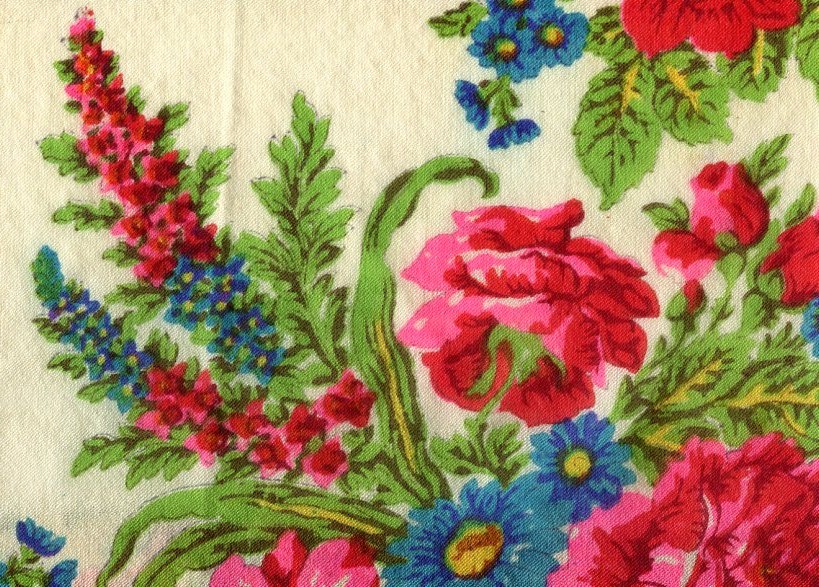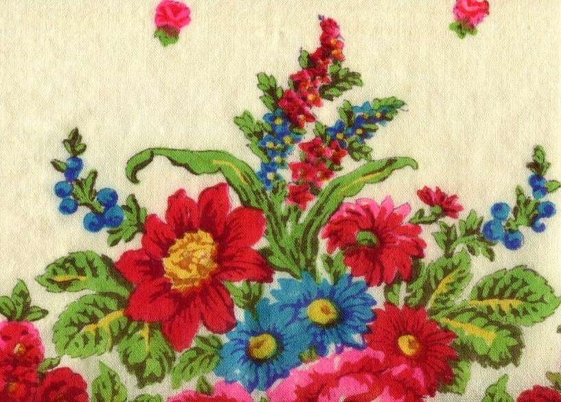 Вспоминаю, как принесла платок домой... Как "ползали" с Юлей взглядом и пальчиками по рисунку (практически не ощущая характерного "сундучного" запаха) и не могли от него оторваться. То, что перед нами платок ручной набойки, поняли сразу. Нашли точки, ниточки, неточности. И это всё было так естественно и живо, будто платок только вчера напечатали. Помню, как бережно его стирала. Какие прочные и надёжные оказались краски...