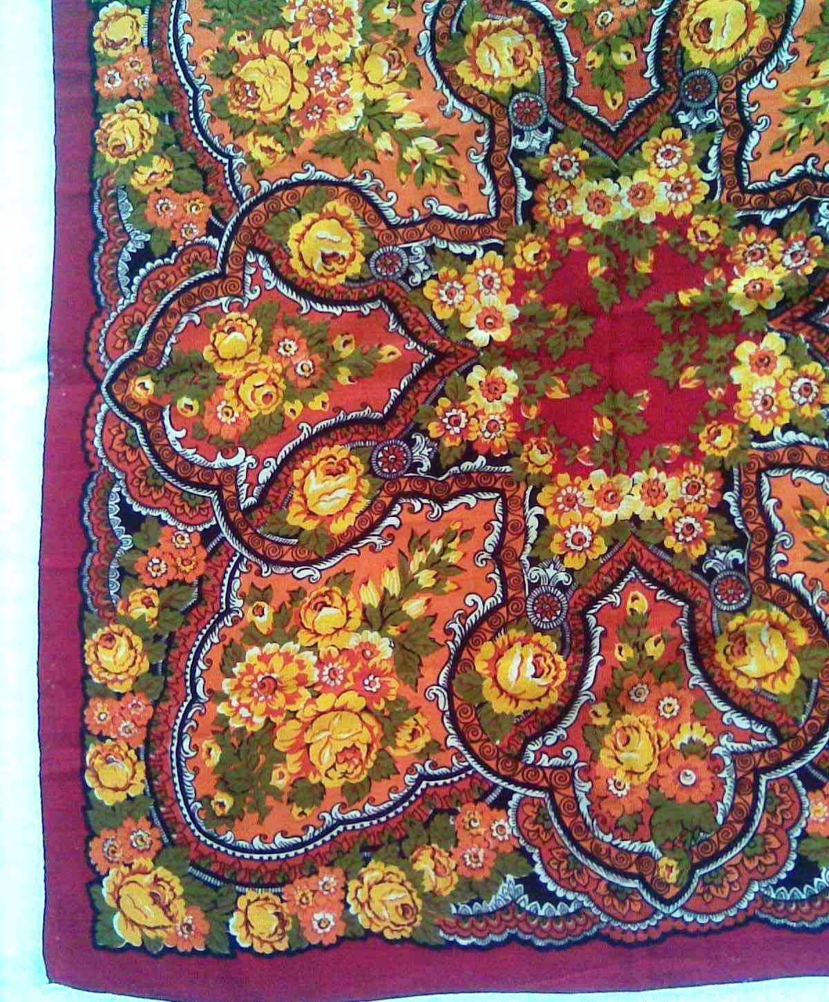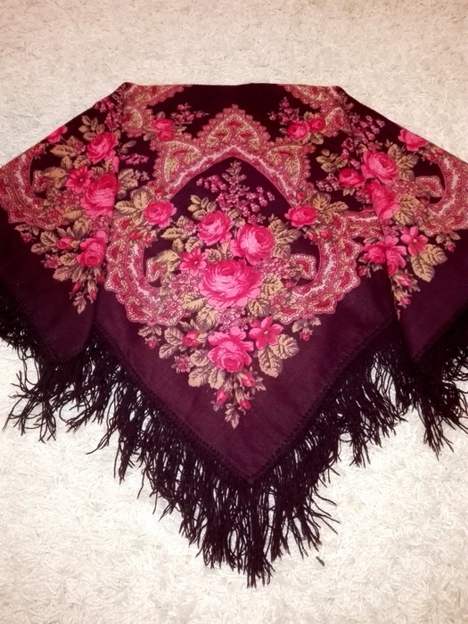 Платок маленький - стороной 88 см, даже не 89 см. На нём никаких опознавательных знаков. Этикетку я помню, была обычная белая, бумажная, вшитая в кайму оверлоком. На ней было написано, что это Павловопосадская фабрика. Ему лет столько, сколько мне, и куплен мамой для меня, и куплен он году в 1978 примерно. Может, и позже, но не позднее 1979 года. Был очень дорогим, несмотря на маленькие размеры. Когда я доросла до него, а было это, когда мне стукнуло 16 лет, то на второй же день я прожгла его на кухне: от спички отлетела искра. На платке видны крошечные ожоги, размером с пылинку. Мама рассердилась и отняла его и спрятала туда, где он лежал шестнадцать лет. Затем, года в 23, опять я до него добралась, и тут мама была бессильна: я его закалывала при помощи янтарной брошки. От этого тоже остались три крошечные дырочки. Вот если бы не это, можно было бы сказать, что платок выглядит, как новый. При своей яркости цвета спокойные. И всего пять красок на нем. А эффект... Я убеждена, что он кисти Слащёвой. Я его сама для себя называю "Мини-Финифть". Не сочтите за самоуверенность, а вглядитесь в эти розы... ппу_109