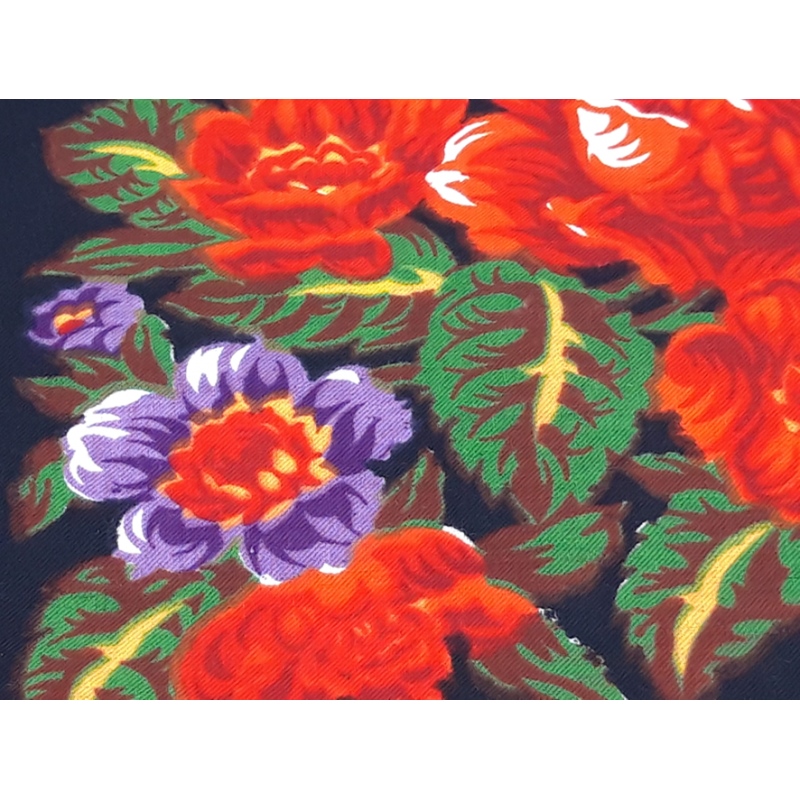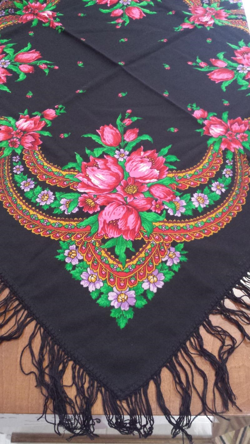 Множество сходства в композиции (контрастная, в данном случае - красная, полоса по периметру), в деталях - цветочки, веточки, "бусинки" на веточках, красная штриховка, заполняющая поле: в этом платке - в сердечках, в наших "португальских" платках -в листочках рогов изобилия, узор из "кочережек" по линиям контуров и многое другое.