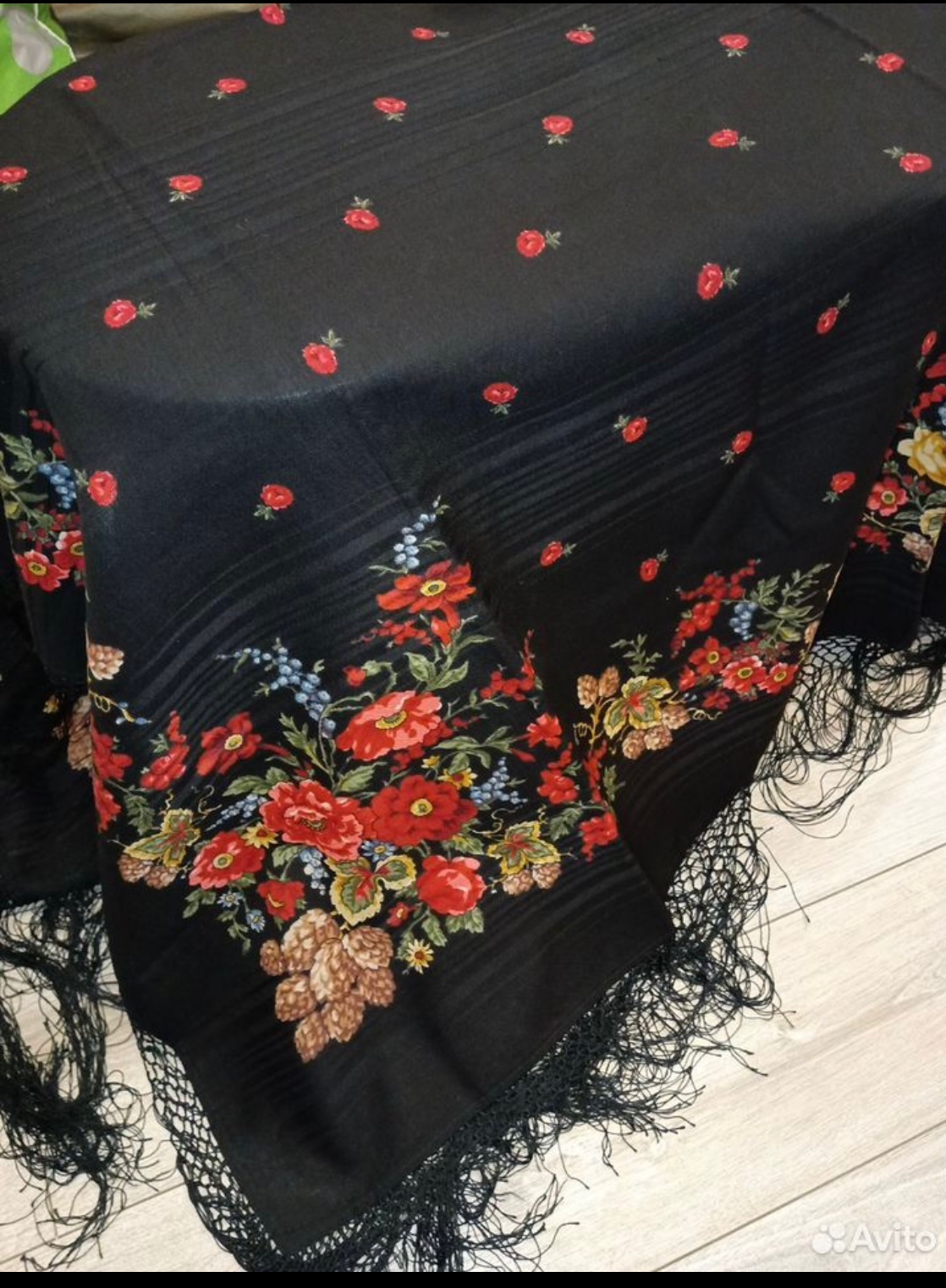 Платок на проосновках, ещё без бахромы, с бумажной этикеткой.