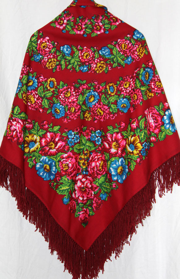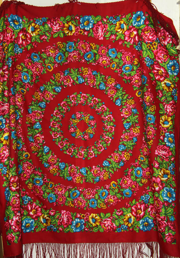 Глядя на шаль, которую показала Фрейя, вспомнила, что ведь и у меня есть похожая. Достала, сравнила, рисунок практически идентичен. У меня шаль бордовая, когда и откуда появилась в доме уже и не помню. Вид у нее совсем не такой шикарный, а весьма уже потасканый, и бахрома пришита тесьмой, а не ручной вязки. Никогда не думала, вернее не задумывалась, что она из натурального шелка, не производит она такого впечатления.