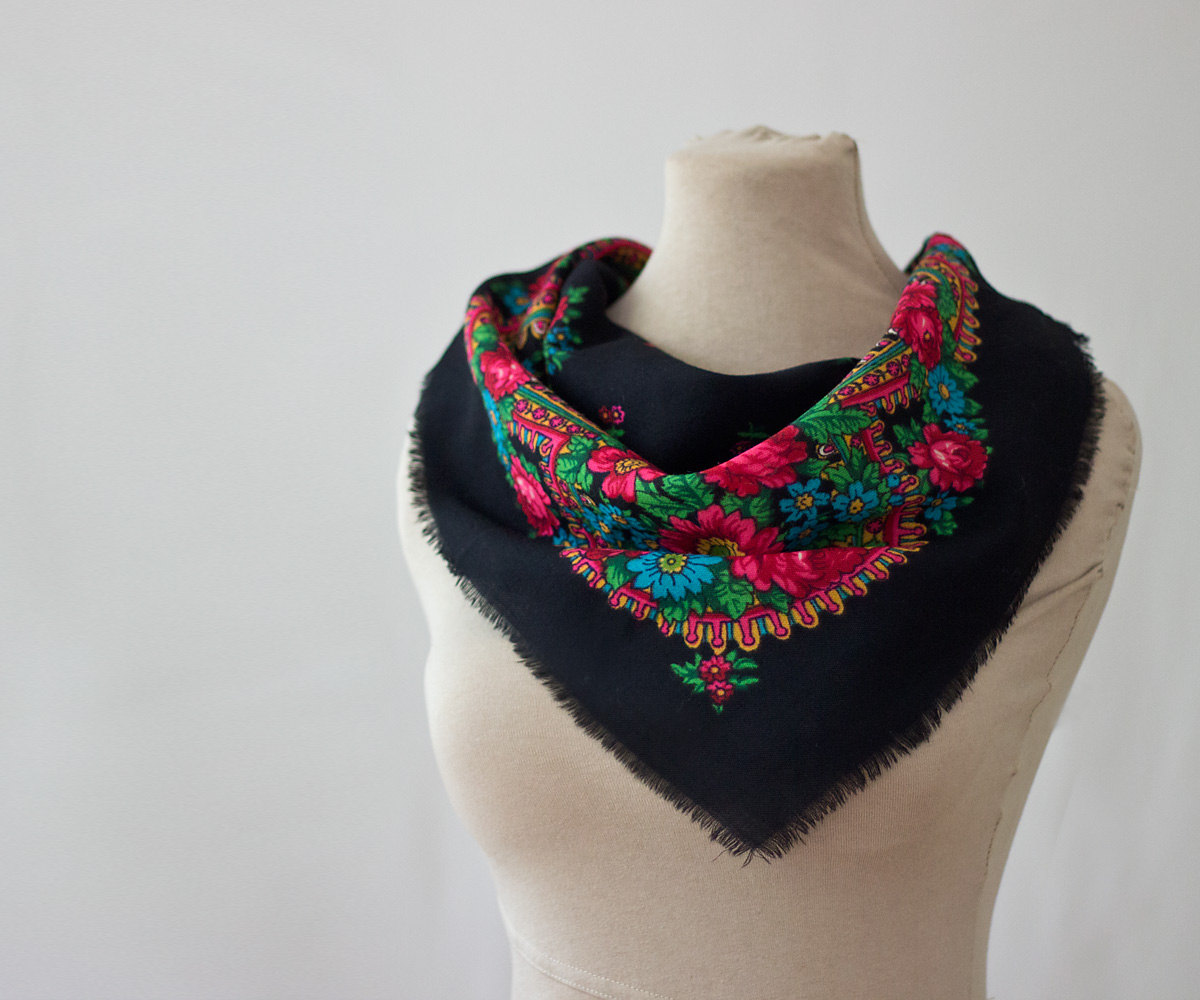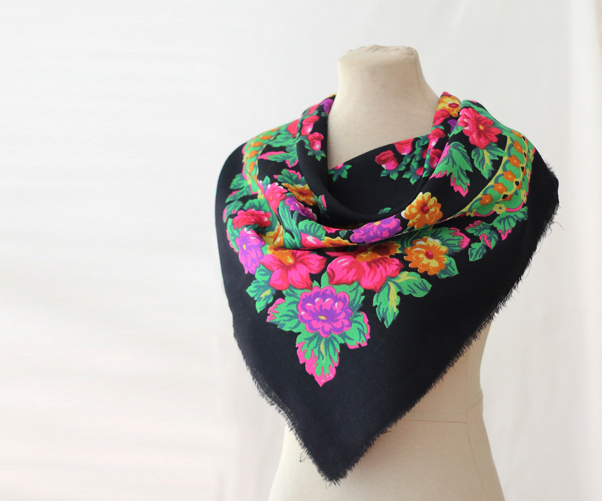 Платок шерстяной 89х89 с декорированным цветочным орнаментом по кайме