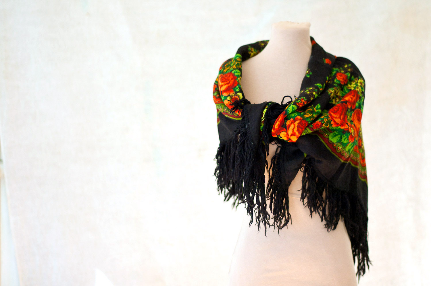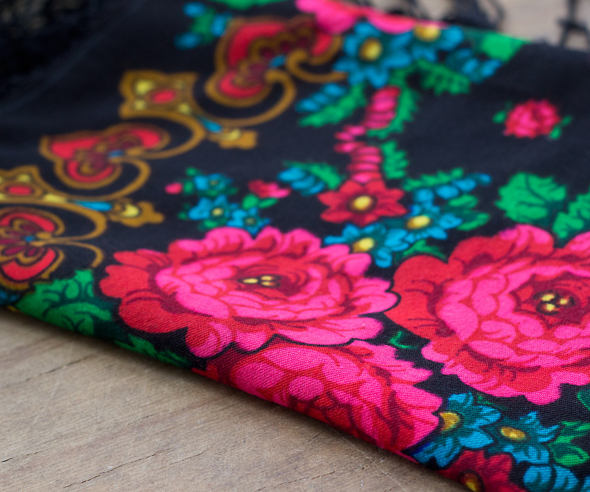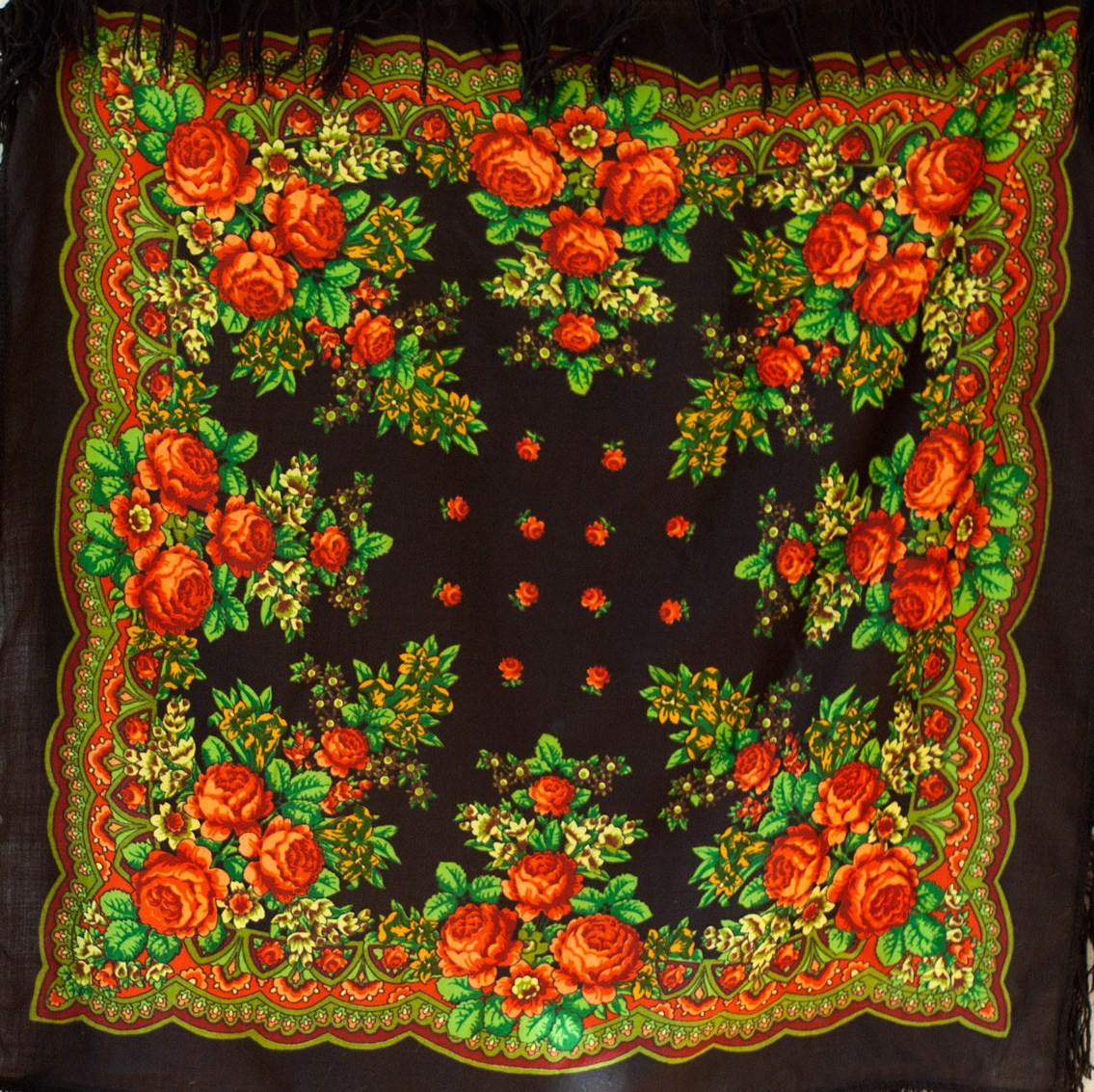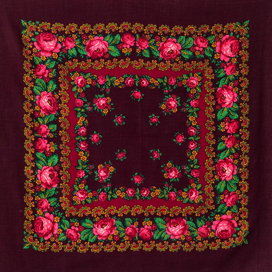 Платок шерстяной 96х96 с букетами роз, бусами и резным цветным орнаментом