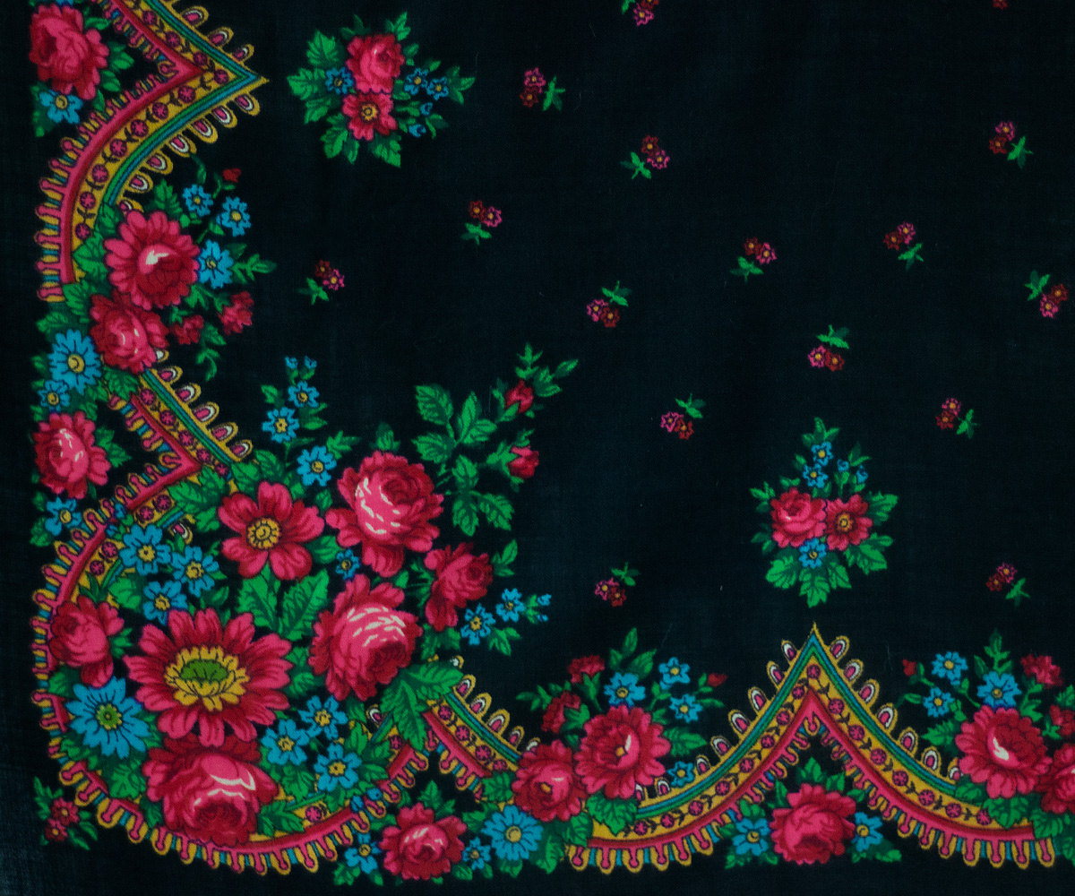 Платок шерстяной 95х95 с цветочно-орнаментальной композицией с фестонами по краю орнамента. 1980-е гг.