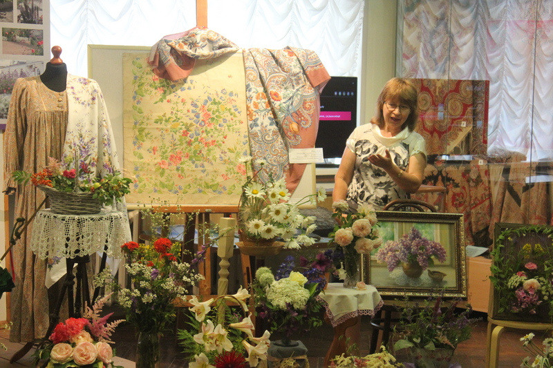 Интересно, что на выставке представлены не только живые цветы, но и картины и платки с изображениями цветочных букетов: талант и мастерство художников соревнуется с природой. Здесь же можно увидеть уникальный крок платка работы Лидии Шаховской, интересный в том числе тем, что на нём изображена не традиционная посадская роза, а полевые цветы средней полосы России.