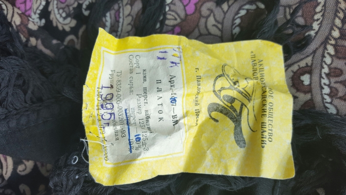 Обнаружила на хлопковой винтажной шали вшитую бирку с выцветшим номером бахромщицы, но не тканевую, а бумажную. Номер был напечатан на обратной стороне части этикетки Городковской фабрики