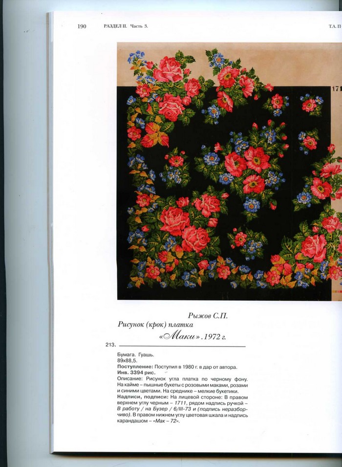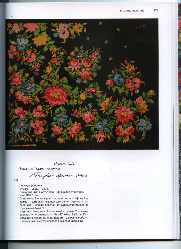 12. Платок, автором рисунка которого И.П. Дадонова уверенно указала С.П. Рыжова. Действительно, в каталоге приведен крок очень похожей шали "Голубые ирисы" С.П. Рыжова. Думаю, авторство очевидно.