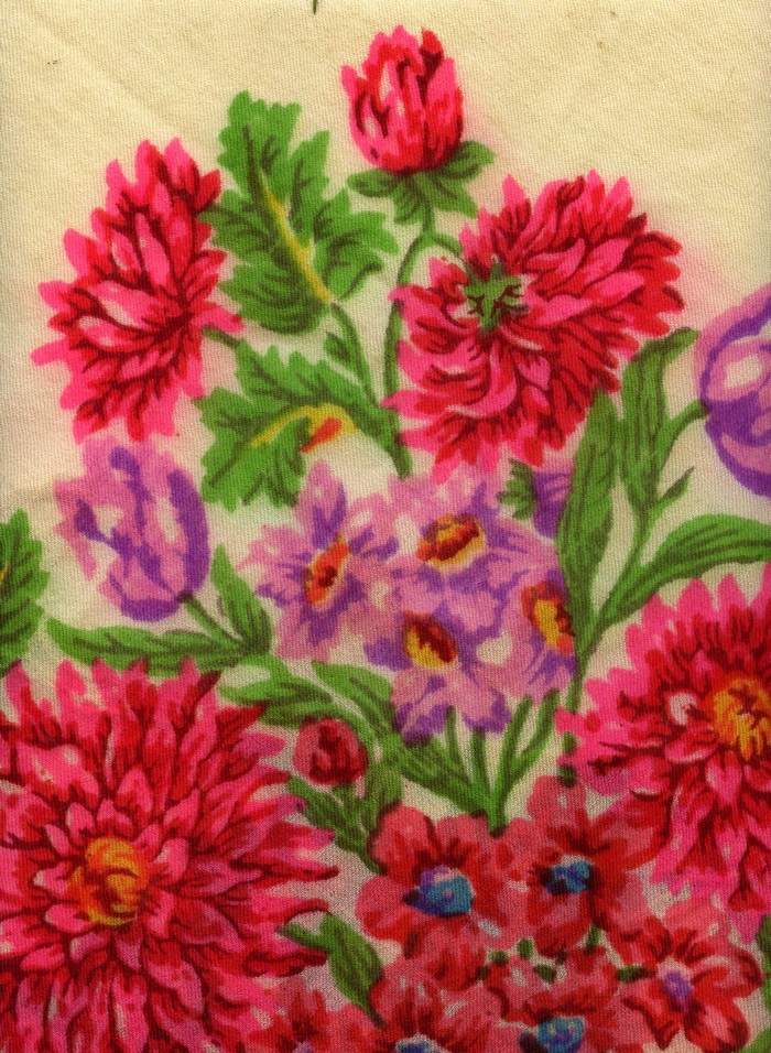 Фирменные георгинчики Евгения Ивановича. И мелкая рассыпуха ( то ли ромашки, то ли еще какие цветочки). Они очень похожи на растительный узор с другого платка ручной набойки, автором которго И.П. Дадонова указала Штыхина. Сравнивала оба платка вживую. Очень похоже. Вот фото для сравнения.