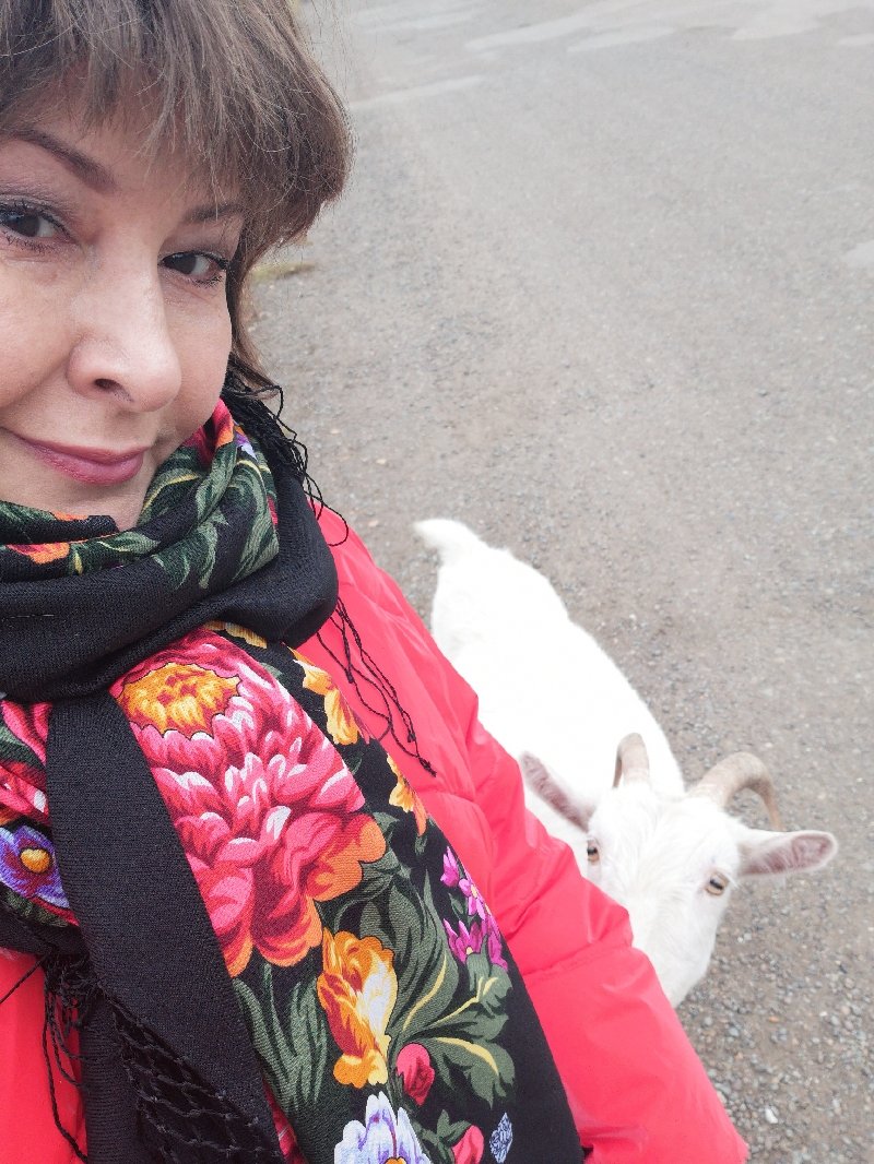 Пошла сегодня утречком на почту, за очередной шалью и за одно за услуги заплатить. Решила за одно выгулять шаль День Победы. Сначала думала Подкову 19, но перетянула День победы. Увязалась за мной коза, чужая. То ли с интересом, то ли с удивлением смотрит. Что уж она там думает ей только известно. А я думаю так девчоночки. Даже козы понимают толк в шалях