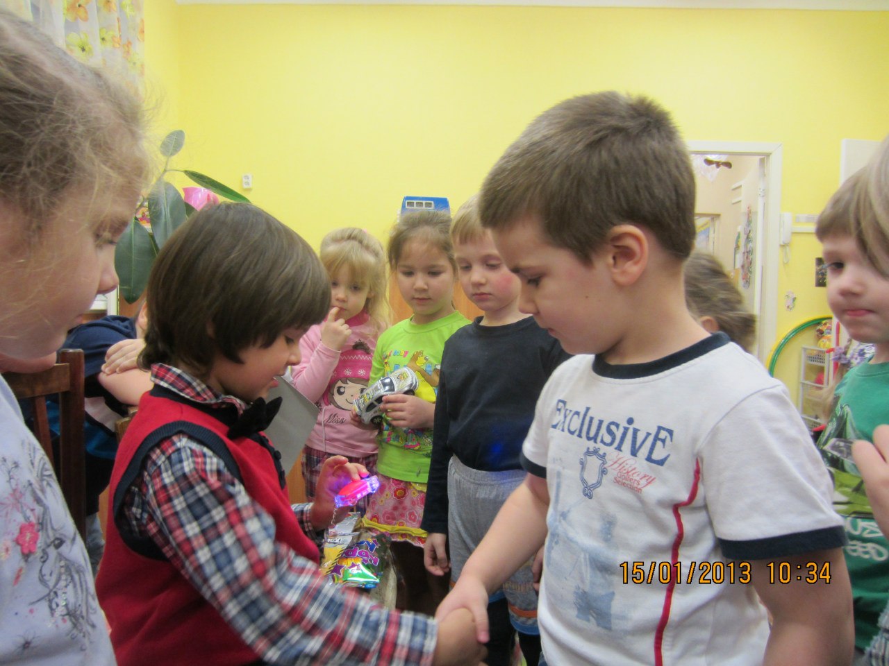 Неделю назад отмечали пропущенный по болезни ДР Егора. Традиционно каждое дите дарит имениннику (имениннице) небольшой подарок. Ну, и слова хорошие говорит...поздравительные)... Руку учат жать и в щечки целовать))). Потом хороводы водят,песни поют. Потом виновник торжества угощает всех.