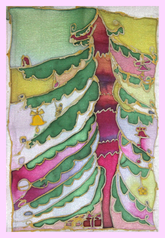 Талантливая работа!Очень радостная и позитивная.Оттенки нежные и чистые. Подарки маленькие, значит, не в них дело. Главная героиня батика - елка!Настроение!Натик, спасибо ребенку. ?*():