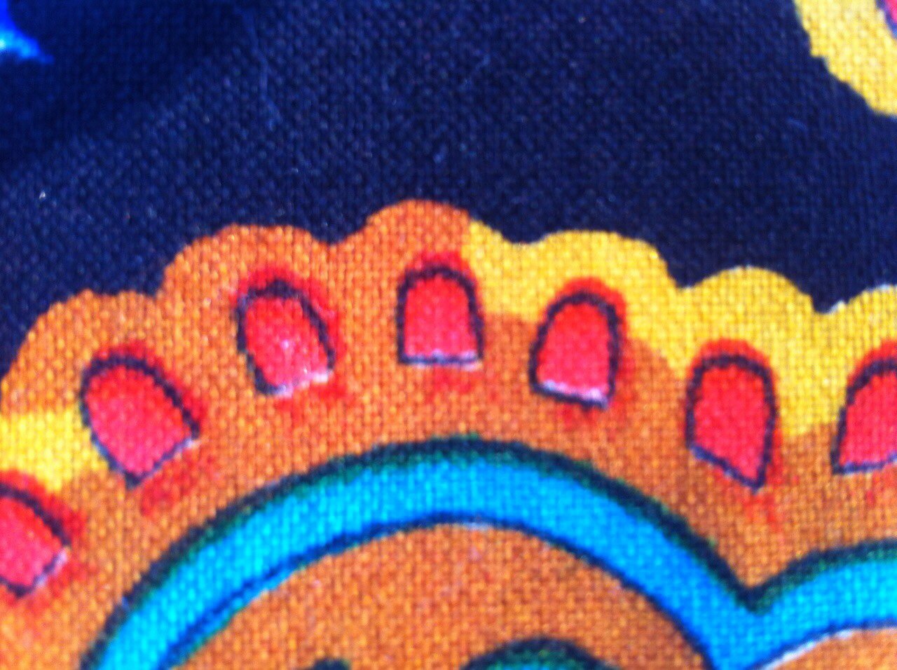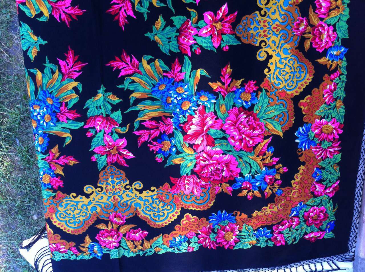Печать 80-х годов. Я видела несколько аналогичных шалей, на шерсти правда, очень похожее качество печати. При ручной набойке тоже разное качество ( как сейчас 1 сорт, стандарт и 3 сорт). У меня была шаль Юбилейная, очень яркие цвета, в т.ч. синий, четкая печать. А потом появилась вторая шаль Юбилейная. У неё печать намного хуже, примерно как на Вашей шали и синий цвет другой. Он и по оттенку и другой, и бледнее и как бы не пропечатан хорошо. А все остальные цвета такие же яркие, как на первой шали. (Кликните, чтобы почитать, что спрятано под катом)...