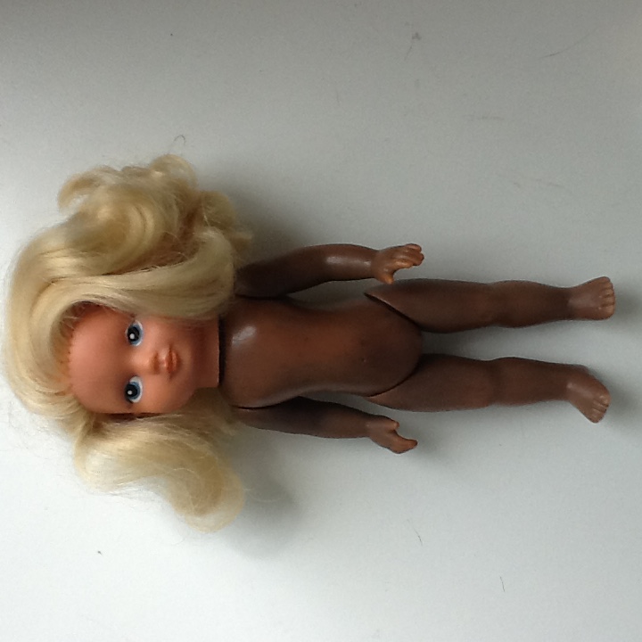 Помыла, почистила, но девочка была почти лысой. Часть волос провалились внутрь головы, часть вылезли совсем. Таня получила новые волосы. Новый мейк (термин кукольников) лица, новую одежду, почищен глазной механизм.