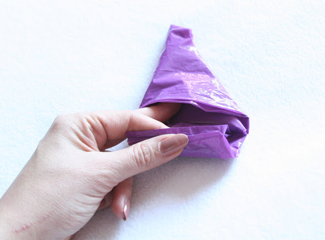 Теперь начинаем складывать снизу, от дна пакета. Берем уголок и сворачиваем его – получился маленький треугольник. Этот треугольник заворачиваем вверх, снова получился треугольник. Сворачиваем так пакет до конца.