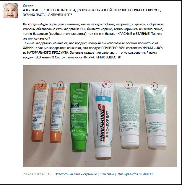 "Опровержение: по словам экспертов, эти метки служат для того, чтобы автомат для резки полиэтилена распознавал место разреза и спайки. Эта метка всегда самого контрастного цвета из палитры, использующейся в дизайне тюбика и абсолютно ничего не означает."