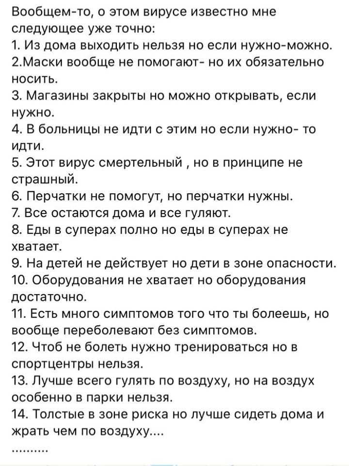 "Один какой-то главный врач главного всего сказал по телевизору, что можно многоразовые маски и банданы дезинфицировать в микроволновке, потому что микроволновка на хорошей мощности убивает все, даже вирусы.