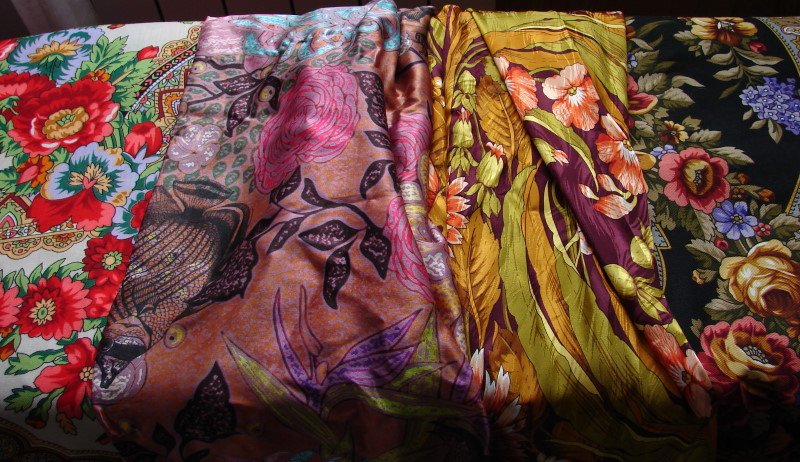 В порядке выгуливания: Подкова-5, Воспоминание о лете-19, Полнолуние-7 и атласный платок с рыбками 10193-16. Последний я очень хотела, искала, мне его из Москвы привезли.