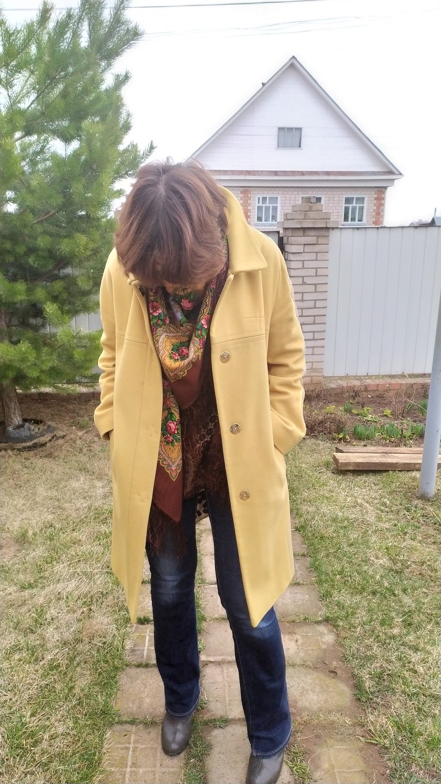 Пошла гулять. По огороду. Возле дома.