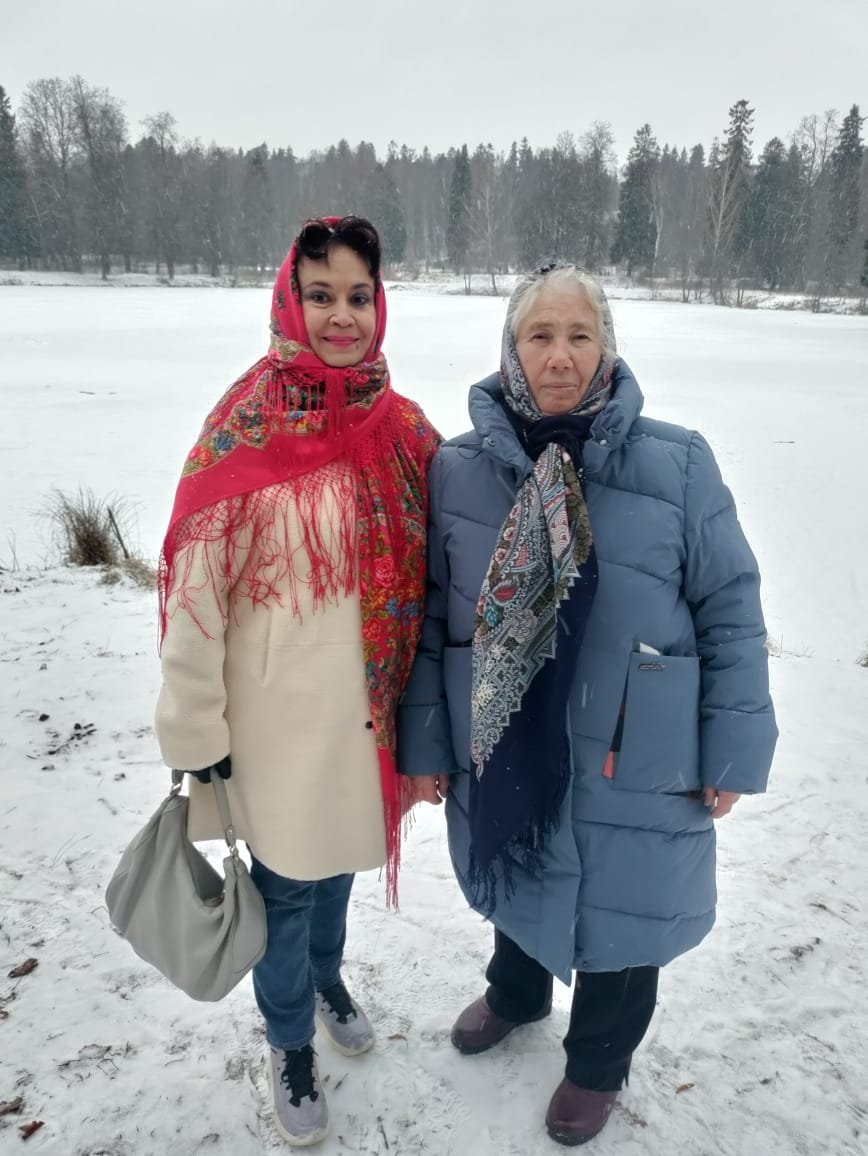 Дорогая Флеринка _Наташенька, не могу не задержаться на таких душевных фотографиях. Очень вам к лицу выбранные платки. Медальоны подчёркивают твою молодость, красоту, подсвечивает прекрасное лицо. А Бархатная ночь очень благородно обрамило свекровушку. Очень вам обем идут платки. Любуюсь!