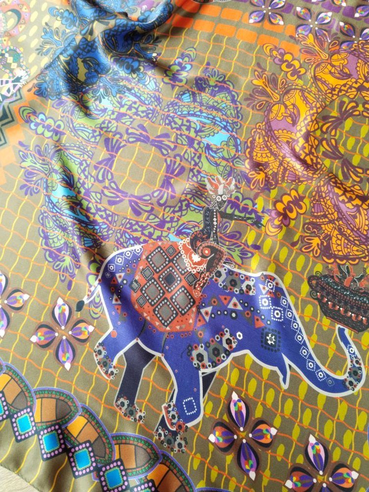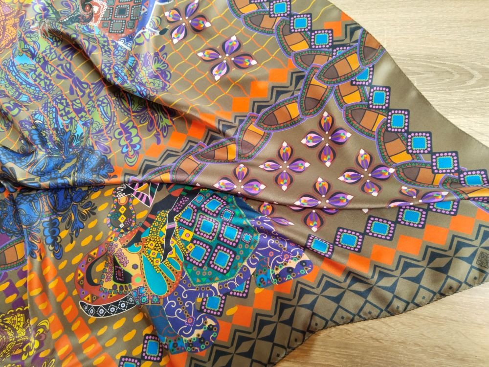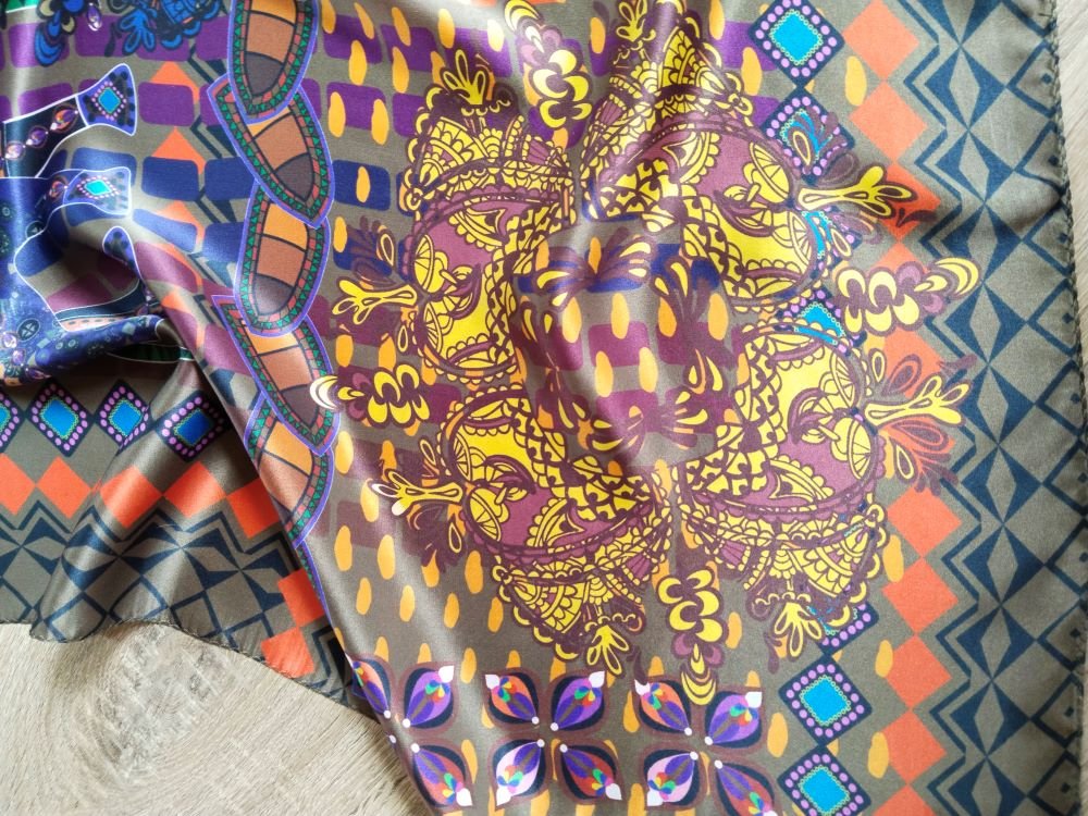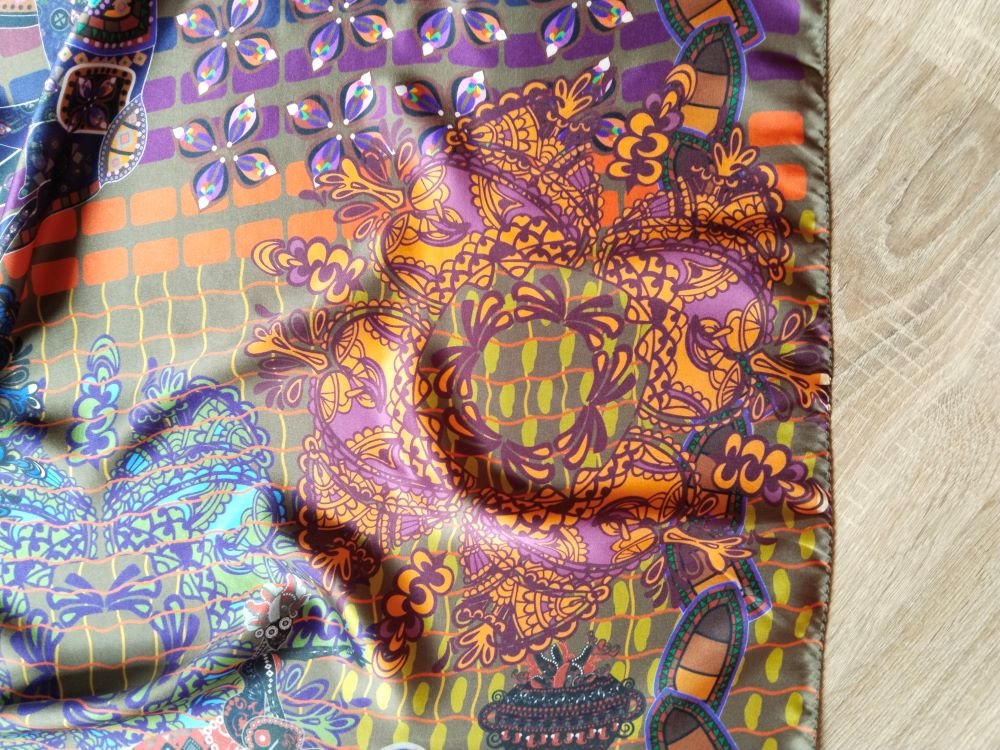 Несмотря на теплый-оливковый основной фон платок может быть синим, фиолетовым, красным, оранжевым, желтым, бирюзовым.