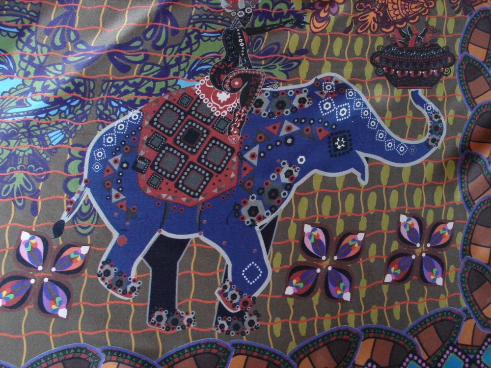И третий слон, тоже синий, в расшитой попоне и шапочке: