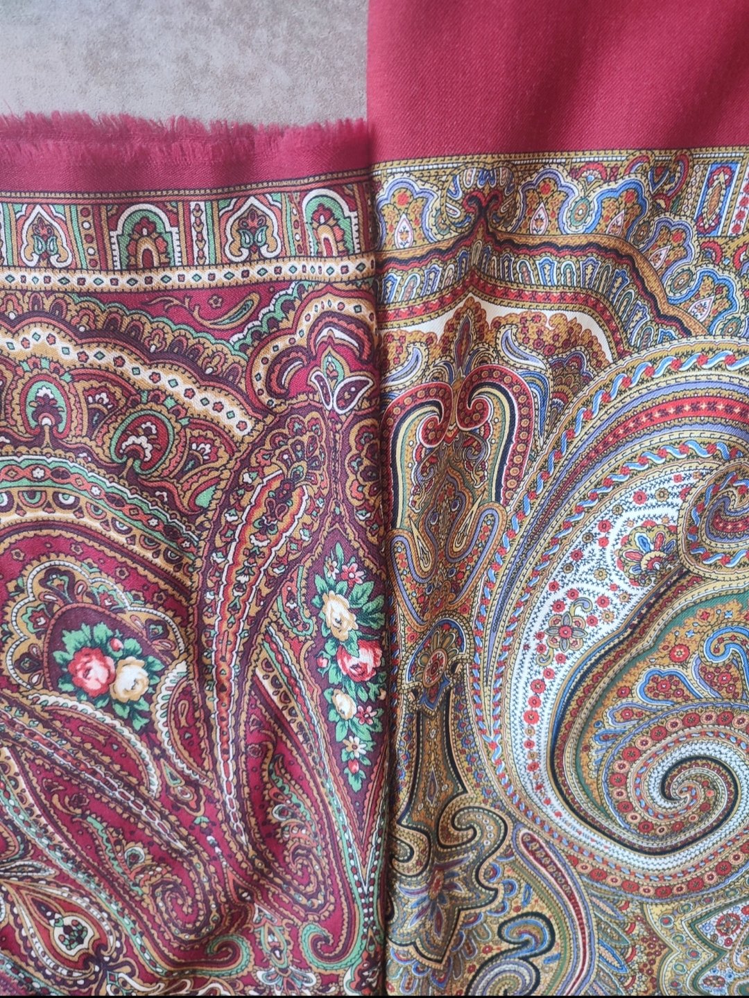 Что касается практичности, то Ожидание из-за активного винного и по причине орнаментального рисунка, мне кажется, более комбинируемым. Но на нем есть охристый оттенок, который может выдавать активную желтизну. Мне это скорее нравится - можно носить шаль с темными-бежевыми - но это мне.
