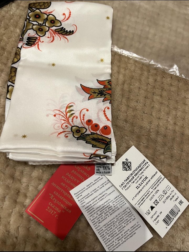Кстати, о птичках. Касательно сообщения redcat от 23 марта. Вот нашла на просторах Сети фото платка с этикеткой по заказу ЗАО Хохломская роспись.